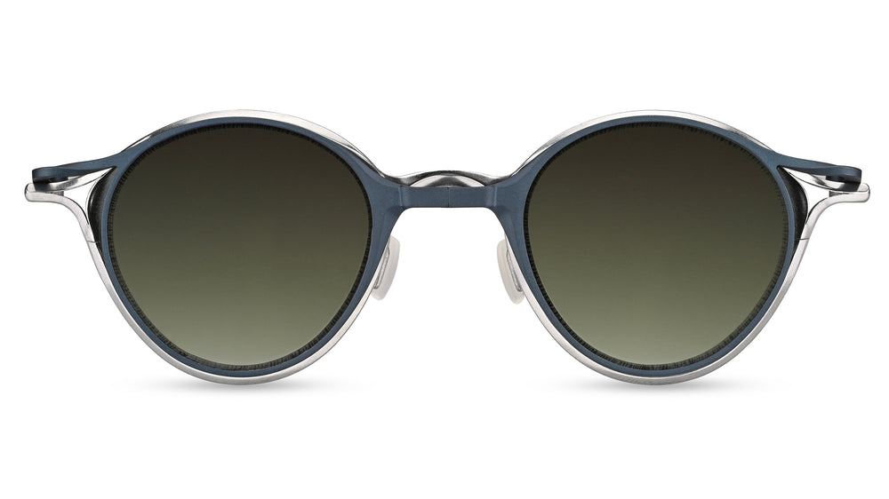 These sophisticated round frames feature a sleek metallic construction with a unique blue-grey tint and gradient green lenses. The design combines vintage-inspired circular shapes with modern industrial elements, including elegant nose pads and minimalist temple arms. The sunglasses showcase excellent craftsmanship with their precise detailing and perfectly balanced proportions, offering both style and functionality in a contemporary interpretation of a classic silhouette.