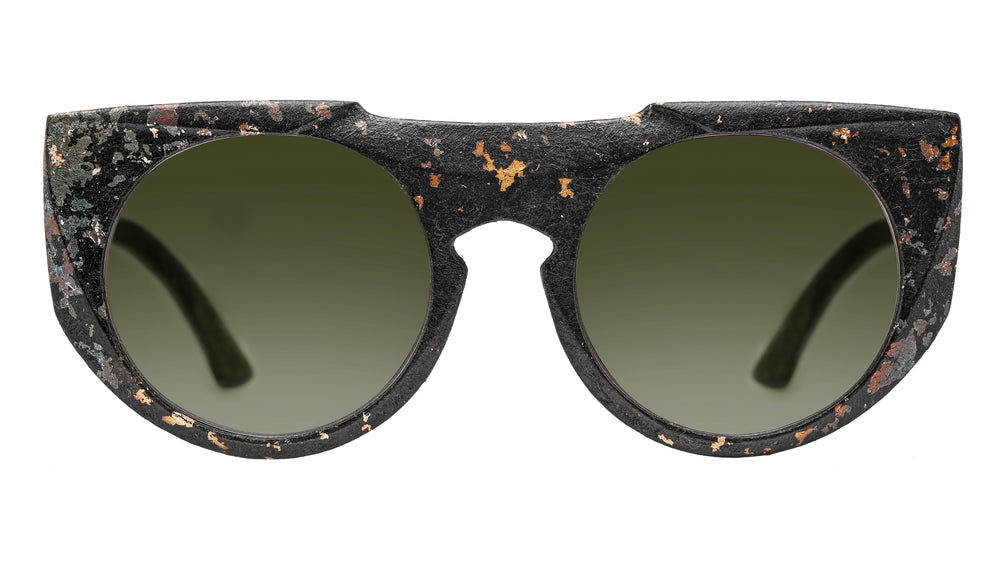 These distinctive round sunglasses feature a heavily textured, distressed black frame with copper/metallic speckles creating an industrial, weathered appearance. The thick, oversized circular frame has a bold presence with green gradient lenses. The design includes protective side shields integrated into the frame, giving it a vintage-meets-industrial aesthetic. The texture appears almost volcanic or metallic-rust like, creating a unique artisanal finish that makes each pair subtly unique. The substantial construction suggests durability while maintaining a fashion-forward, avant-garde design sensibility.