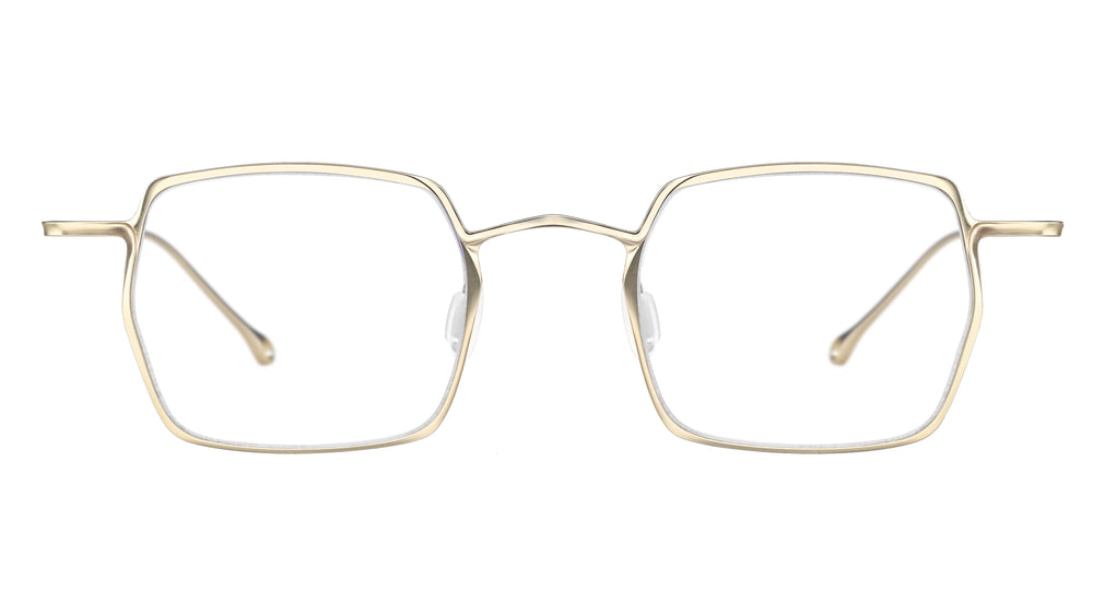 These elegant geometric frames feature a distinctive angular shape with clean lines and a minimalist titanium construction. The sleek gold-toned metal frame has a sophisticated architectural quality with sharp corners and perfectly balanced proportions. The thin profile and lightweight build suggest premium craftsmanship while maintaining a modern, artistic aesthetic. The glasses have a refined yet avant-garde character that would appeal to design enthusiasts.