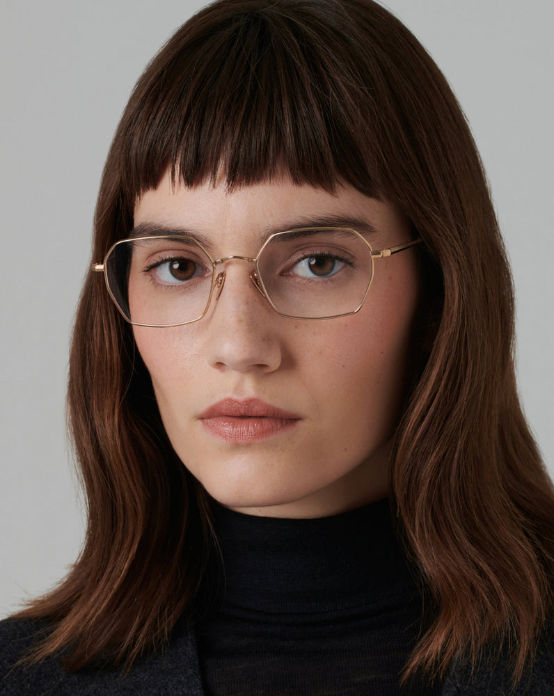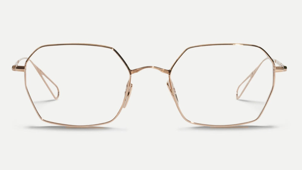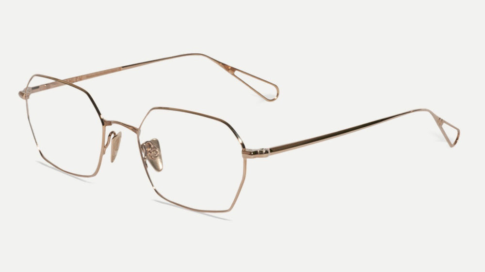 These elegant hexagonal eyeglasses feature a delicate rose gold metallic frame with clean geometric lines. The sophisticated design showcases thin temple arms and minimalist construction that creates a lightweight, modern aesthetic. The angular geometric shape is balanced by the thin frame profile, making these glasses both fashionable and versatile for everyday wear.