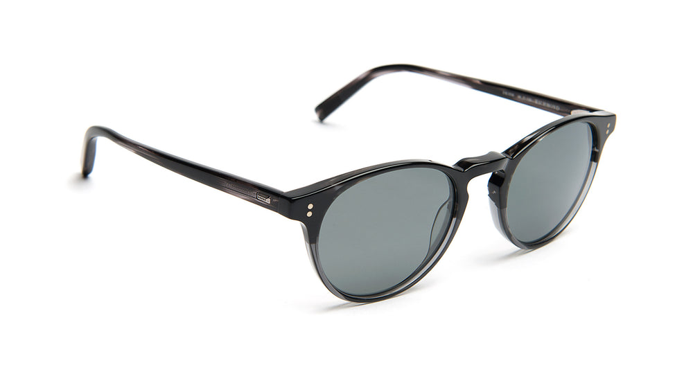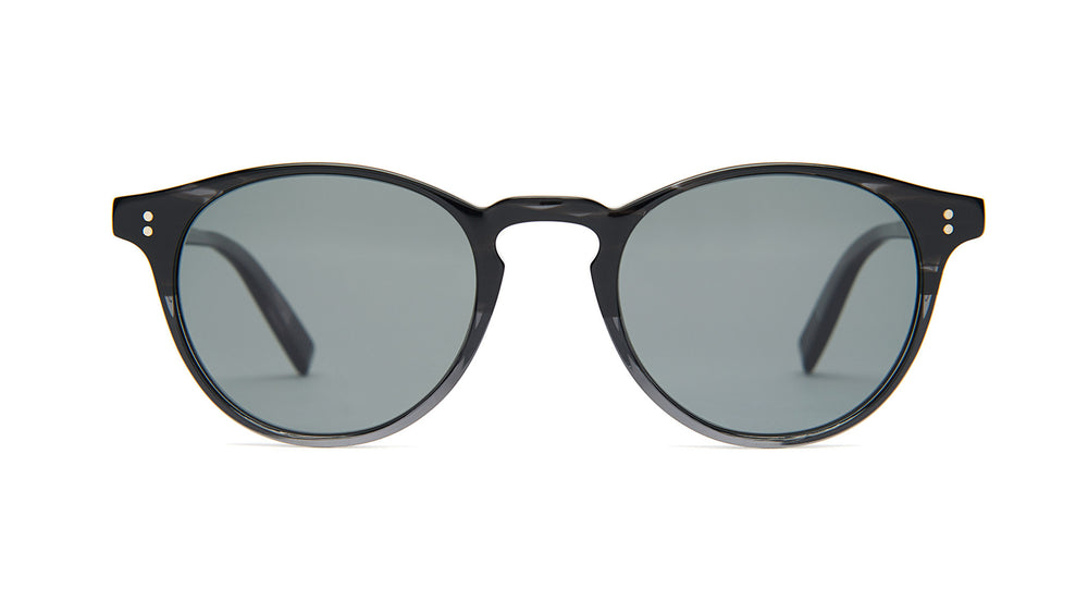 The Richmond is a sophisticated round-framed pair of sunglasses featuring a gradient black to translucent frame. The design incorporates subtle metal studs on the front corners, adding a refined detail to the otherwise minimalist aesthetic. The frame transitions from solid black at the top to a lighter, more transparent shade at the bottom, creating an elegant ombré effect. The lenses are a classic grey tint, perfect for everyday wear. The overall silhouette is timeless and versatile, suitable for both casual and formal occasions.