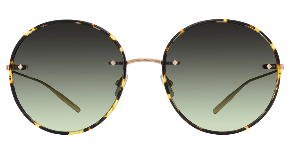 Luxurious oversized round sunglasses featuring a tortoiseshell rim detail against gold metal framework. The gradient green lenses are complemented by delicate diamond-shaped accents at temple hinges. The design balances vintage glamour with modern sophistication through its slim profile and gentle curves. The frame combines metal construction with tortoise acetate trim for an elegant, refined appearance.