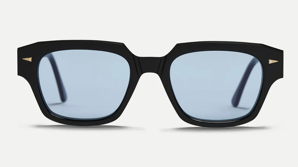 Bold square-shaped sunglasses with a chunky matte black acetate frame. Features clean geometric lines and subtle gold arrow accents at the temples. The lenses are a light blue tint. The design is minimalist and architectural with strong angles and a substantial profile. Distinctive double rivets on temple tips add an industrial-chic detail. The oversized rectangular silhouette offers maximum coverage and makes a confident fashion statement.