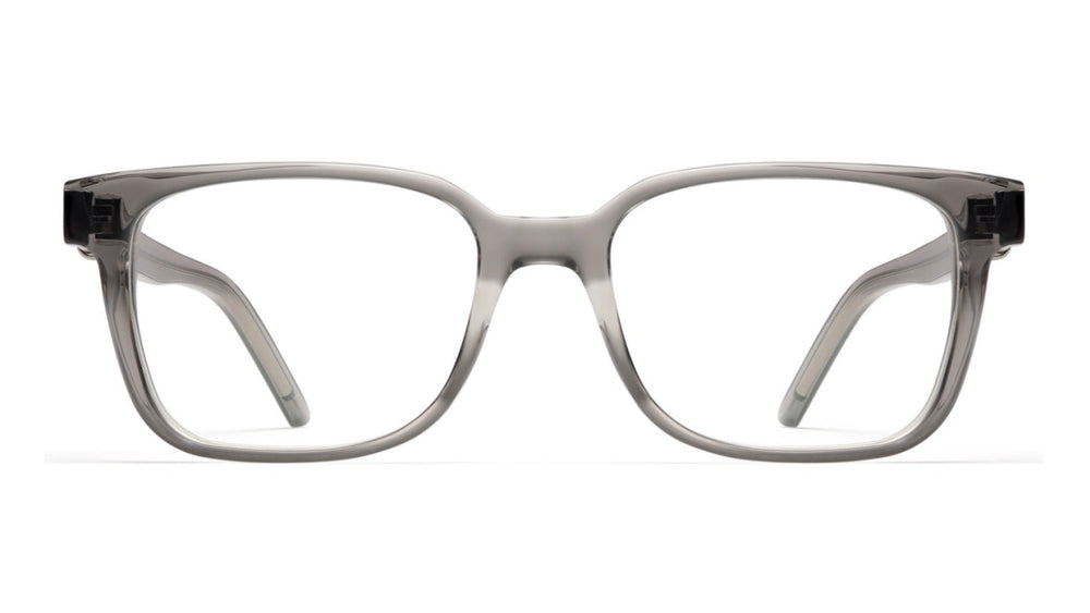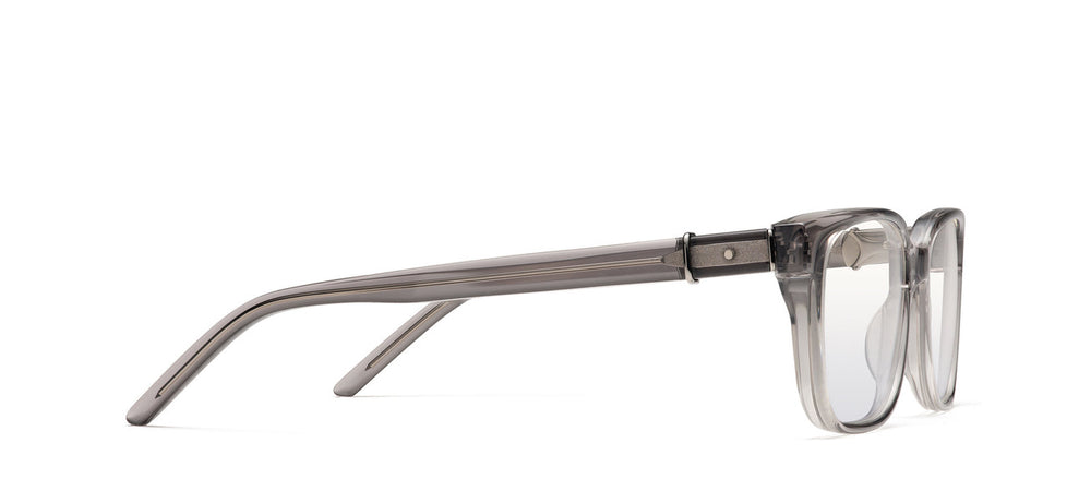 A sophisticated pair of translucent grey rectangular eyeglasses with a modern minimalist design. The frames feature clean lines and a contemporary square silhouette made from high-quality transparent grey plastic. The design maintains a professional yet fashionable appeal with its medium-thick frame construction and matching temple arms. The simple saddle bridge adds comfort while maintaining the sleek aesthetic. The transparent grey coloring gives these frames a subtle, sophisticated look that would complement any face shape or style preference.