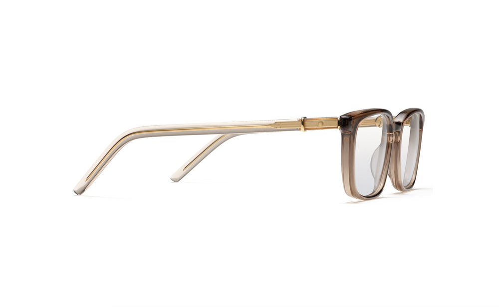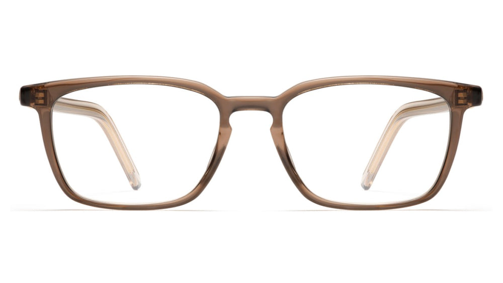These sophisticated rectangular frames feature a translucent brown acetate construction with a modern silhouette. The frame has clean lines with subtle angles, creating a professional yet stylish look. The saddle bridge provides comfortable fit, while the medium thickness offers durability without appearing bulky. The neutral brown tone makes these glasses versatile for any face shape or skin tone. The temple arms smoothly integrate with the front frame design for a cohesive appearance.