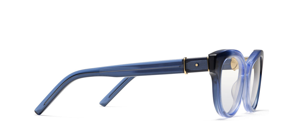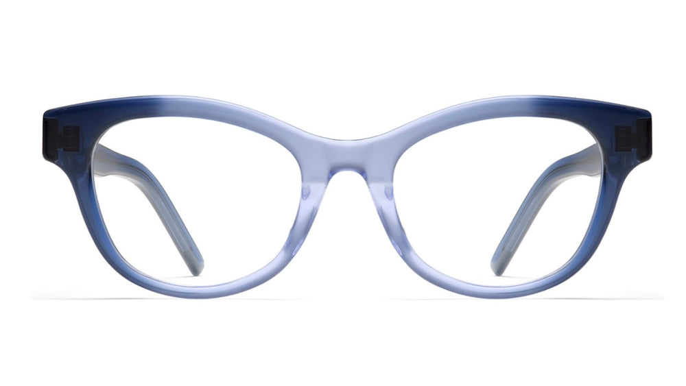 A sophisticated pair of chunky acetate frames in a translucent blue gradient that fades from darker at the top to lighter at the bottom. The frames feature a classic oval silhouette with substantial thickness, creating a bold yet refined appearance. The seamless construction and monochromatic blue colorway gives these glasses a modern, artistic quality while maintaining professional versatility.