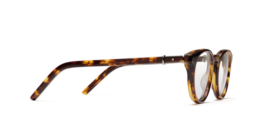 A sophisticated round frame in rich tortoiseshell acetate featuring a classic P3 silhouette. The frame exhibits varying tones of amber and dark brown creating depth and character. The substantial build quality is evident in the thick rim construction while maintaining an elegant profile. The traditional saddle bridge flows seamlessly into the curved front, complemented by sleek temple arms that maintain the tortoise pattern throughout.