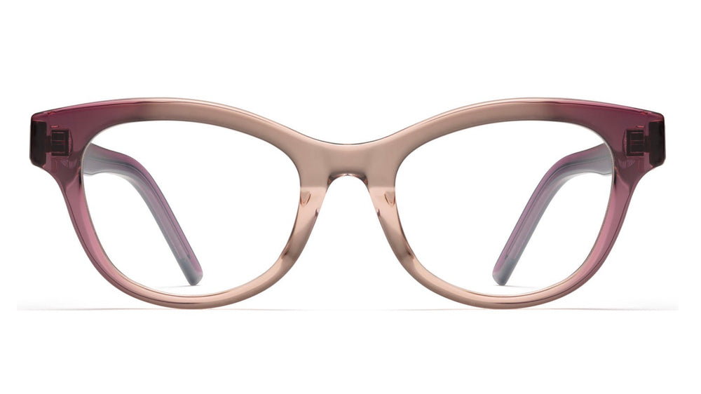 These elegant eyeglasses feature a gradient pink to mauve translucent plastic frame with a sophisticated oval silhouette. The frame exhibits a modern, minimalist design with clean lines and a subtle cat-eye influence. The monochromatic color scheme and medium thickness create a balanced, contemporary look suitable for professional and casual wear. The saddle bridge offers comfortable fit, while the streamlined temples complete the refined aesthetic.