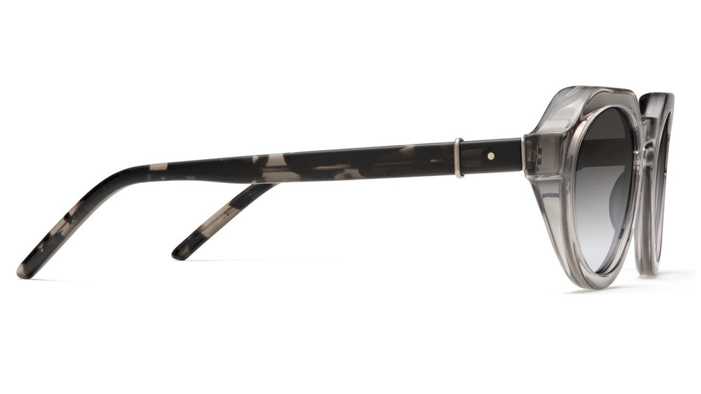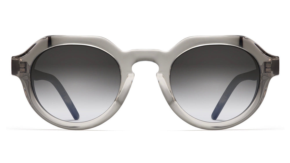 These sophisticated round-frame sunglasses feature a translucent smoke grey acetate construction with a minimalist design. The frames have a vintage-inspired silhouette with gradient grey lenses and clean lines. The monochromatic color scheme and modern interpretation of a classic shape creates a refined, contemporary aesthetic suitable for any face shape.