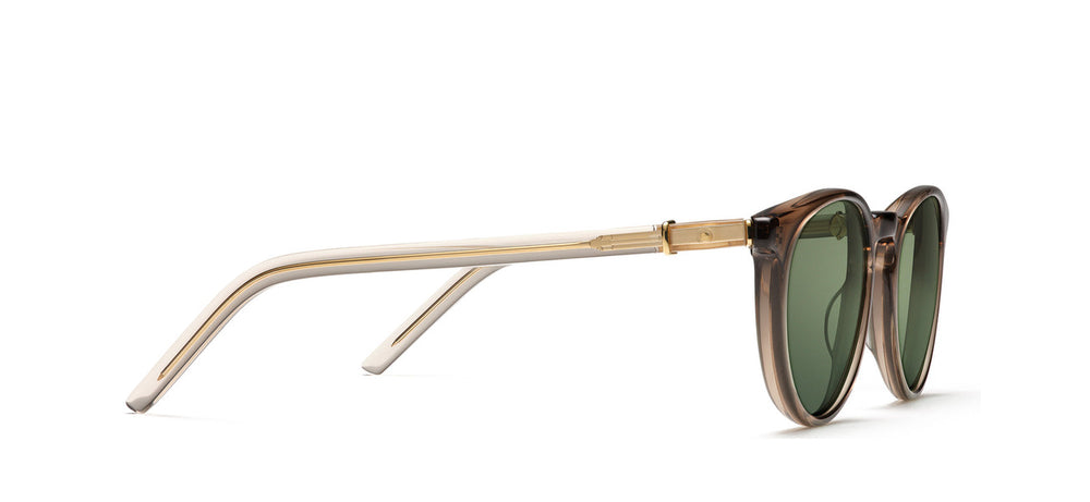 These elegant round sunglasses feature a translucent bronze-tinted frame with a classic silhouette. The medium-thickness frame offers a sophisticated look while maintaining durability. The green-tinted lenses are complemented beautifully by the warm bronze coloring of the frame. The design is timeless and versatile, suitable for various face shapes and styles. The saddle bridge provides comfortable fit, while the matching temple arms complete the cohesive aesthetic. The sunglasses strike a perfect balance between classic styling and modern sophistication.