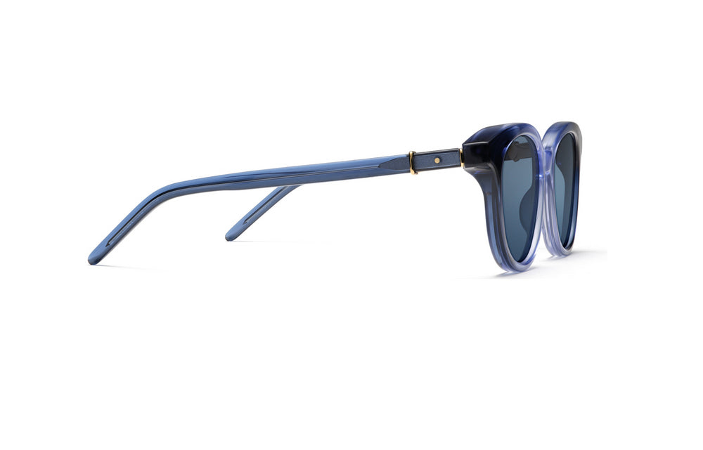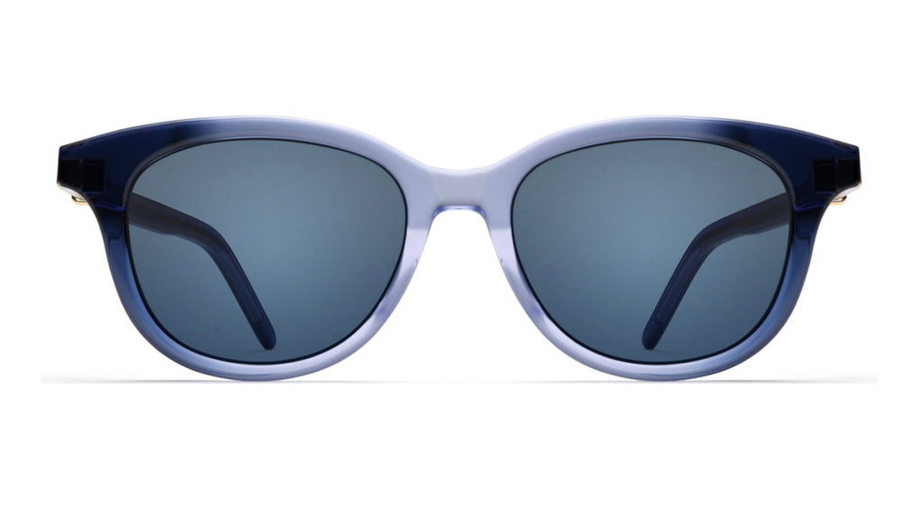These elegant oval sunglasses feature a sophisticated gradient blue frame that transitions from deeper navy at the top to a lighter translucent blue at the bottom. The frame has a modern, clean design with smooth contours and a classic silhouette. The lenses are a solid blue tint, offering full sun protection while maintaining a fashionable appearance. The construction appears sturdy yet refined, with integrated nose pads and seamless temple transitions that suggest premium quality craftsmanship.