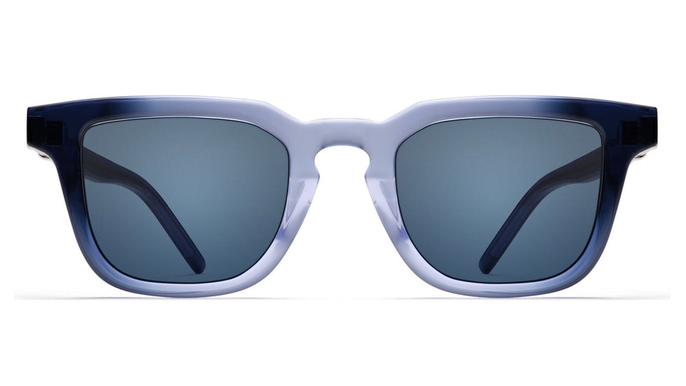 A sophisticated pair of wayfarer-style sunglasses featuring a gradient blue-to-clear acetate frame construction. The frames showcase a bold, architectural design with clean lines and a contemporary flat-top silhouette. The substantial square lenses are fitted with dark blue tinted glass, offering excellent sun protection while maintaining a stylish aesthetic. The design demonstrates expert craftsmanship with its seamless color transition and robust build quality, perfect for the fashion-conscious urbanite seeking both style and functionality.