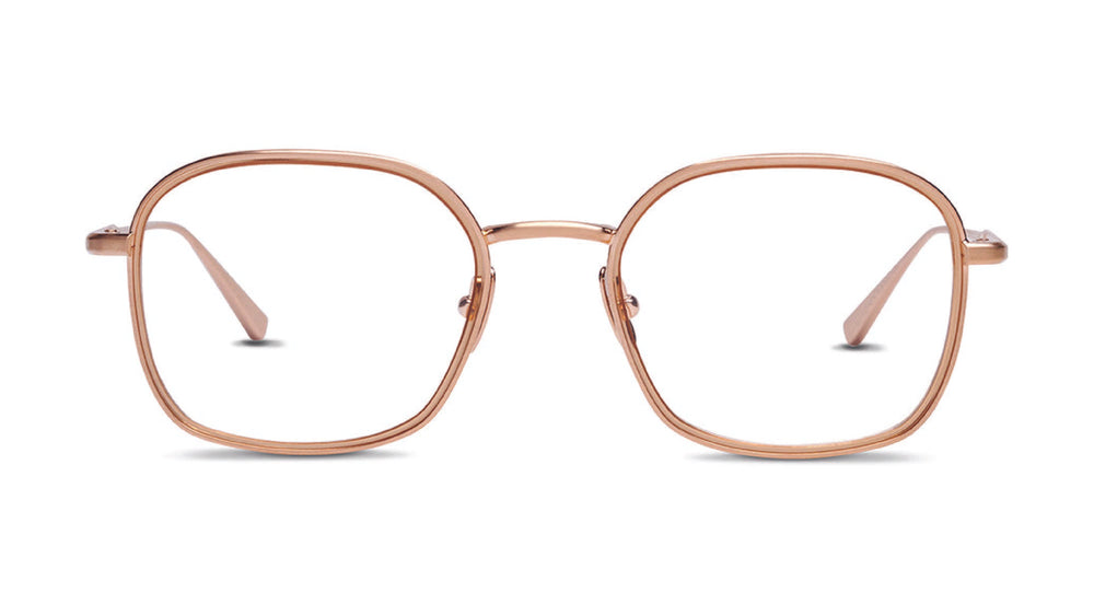 Elegant rose gold geometric frames with a modern, minimalist aesthetic. The thin metal construction creates a lightweight, sophisticated look ideal for both casual and professional settings. The squared-off geometric shape with softly rounded corners offers a contemporary twist on classic eyewear design. The uniform rose gold/bronze finish across the frames, temples, and bridge creates a cohesive, premium appearance.