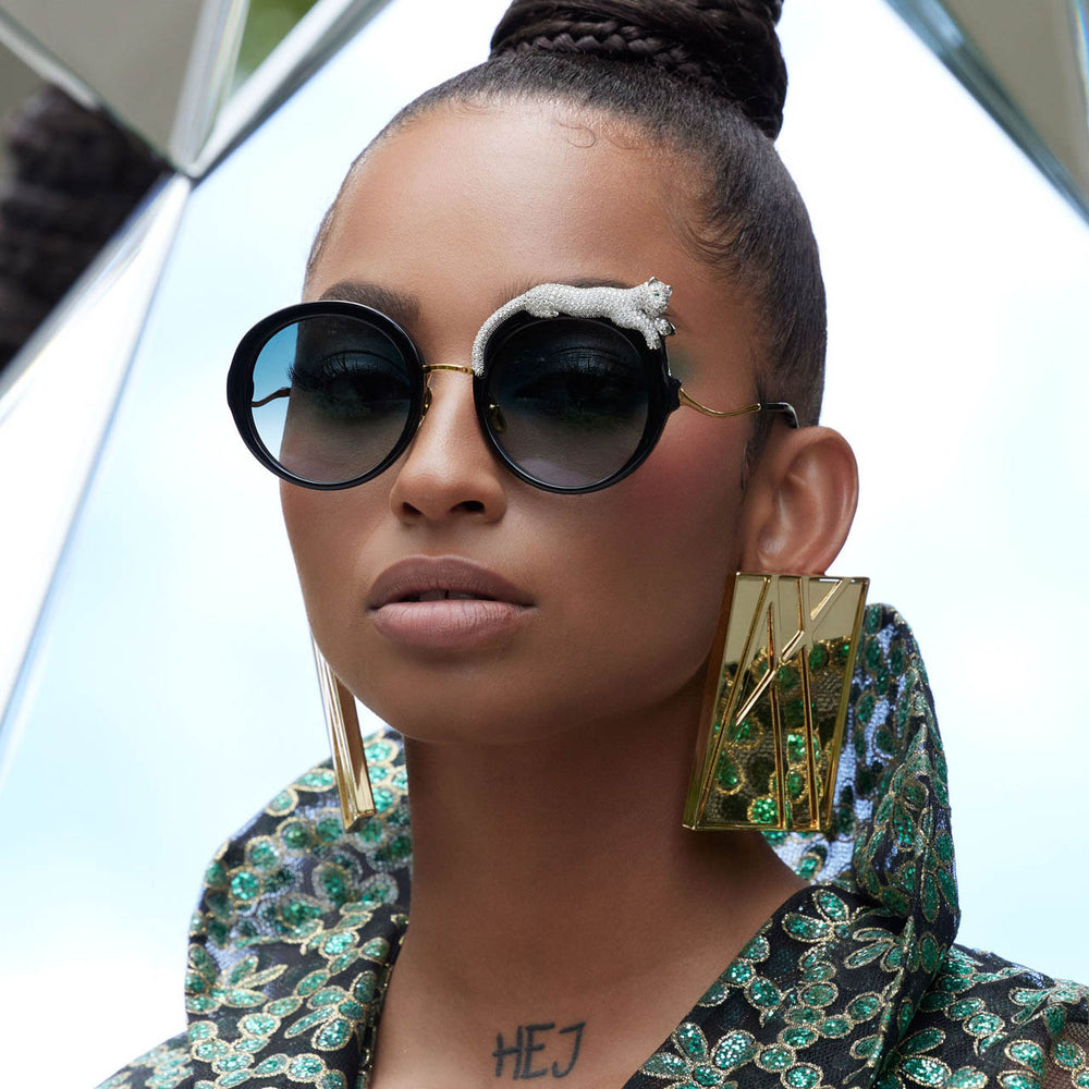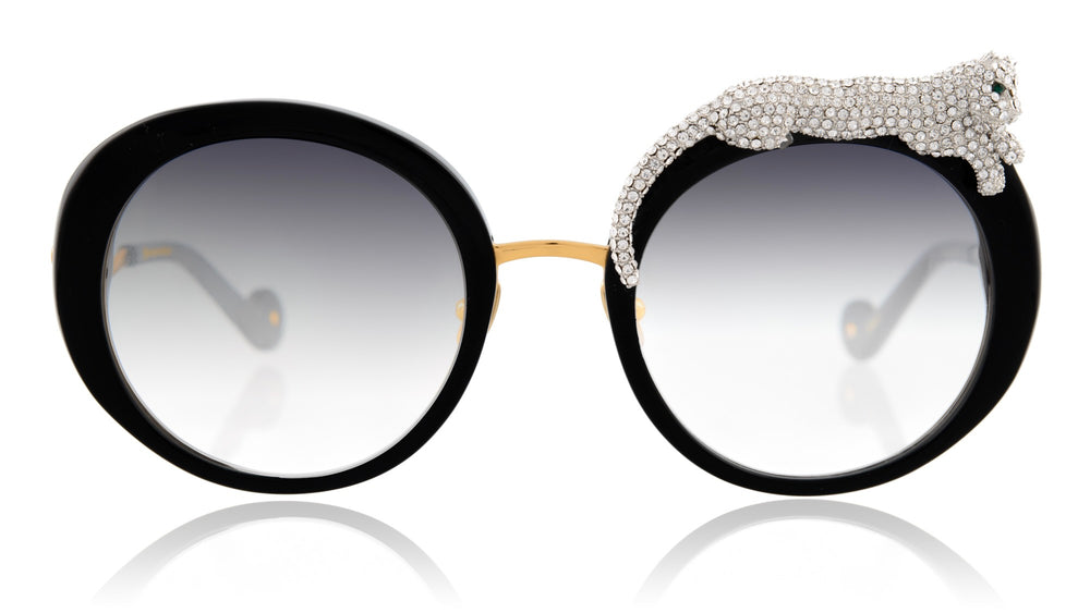 Luxurious oversized round sunglasses with a striking crystal-embellished panther decoration on the right frame. The design features black acetate frames with gold metal bridge and temple details. The gradient grey lenses are complemented by the dramatic crystal-studded panther embellishment that curves elegantly over the top right corner, adding a bold sculptural element. These are statement designer sunglasses that blend glamour with artistic expression.