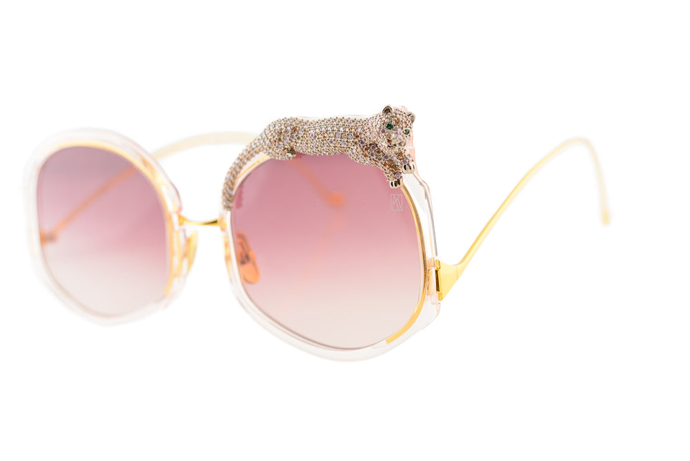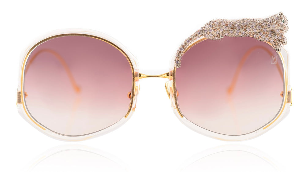 Luxurious oversized oval sunglasses with a gold metal frame and gradient pink-tinted lenses. The distinctive feature is an ornate crystal-encrusted decorative element on the right temple, resembling a delicate wing or floral motif. The frame combines elegance with avant-garde design, featuring graceful curves and white enamel accents along the frame edges. The sophisticated design speaks to high-end luxury fashion, with its combination of precious metal finish and decorative crystalline elements.