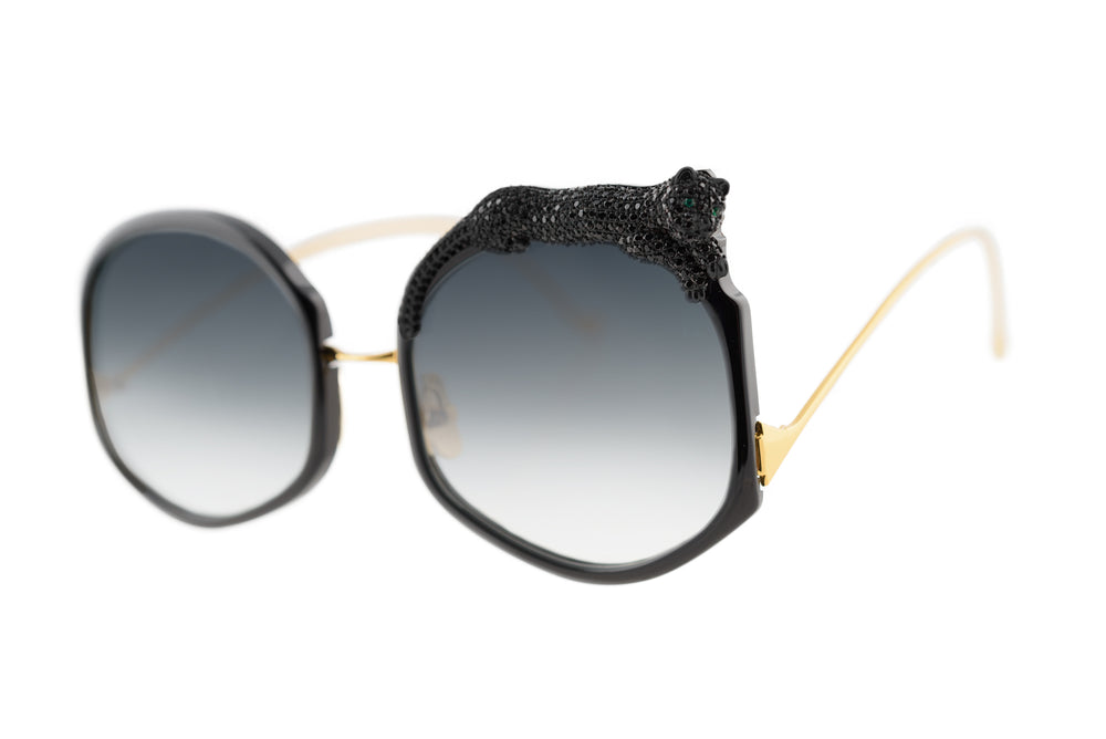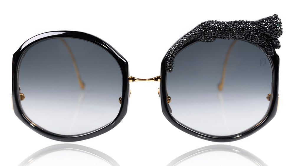 Luxurious oversized geometric sunglasses with black frames and gradient grey lenses. Features distinctive crystal embellishments adorning the top right corner, creating an asymmetrical decorative element. The frame combines black acetate with gold-tone metal accents, particularly visible in the bridge and temple connections. The design showcases an avant-garde aesthetic with its unique shape and crystal detailing, making it a statement piece. The gradient lenses transition smoothly from dark to light grey, and the overall construction suggests high-end craftsmanship typical of luxury eyewear.