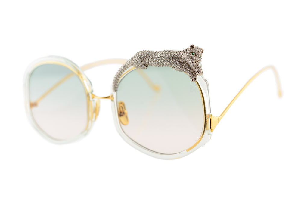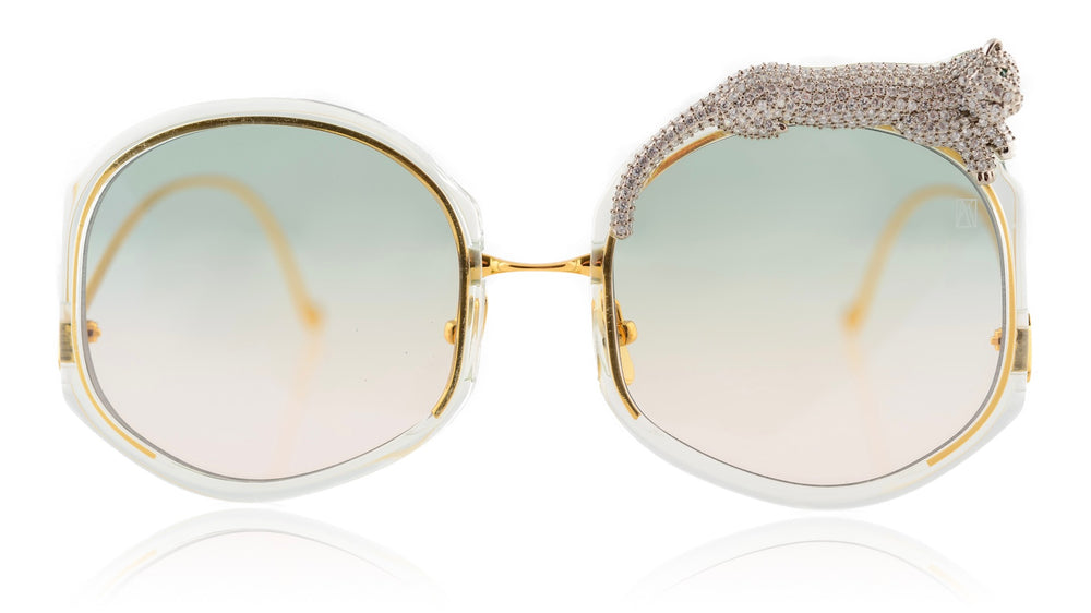 These luxurious oversized geometric sunglasses feature a distinctive white and gold metal frame with an elaborate crystal-encrusted embellishment adorning the upper right corner. The frames blend elegant curves with angular geometric shapes, creating a dramatic silhouette. The lenses have a subtle gradient tint from mint green to clear. The design showcases expert craftsmanship with its intricate metalwork and premium finish, making it a statement piece of eyewear that combines avant-garde design with classical elegance. The decorative crystal detail adds a touch of glamour and luxury to these sophisticated frames.