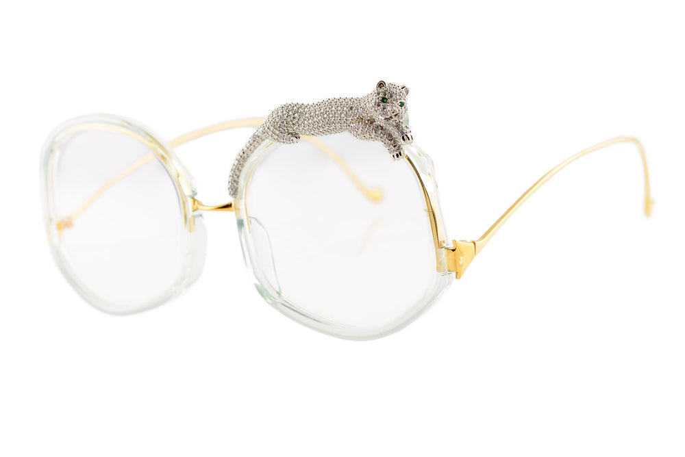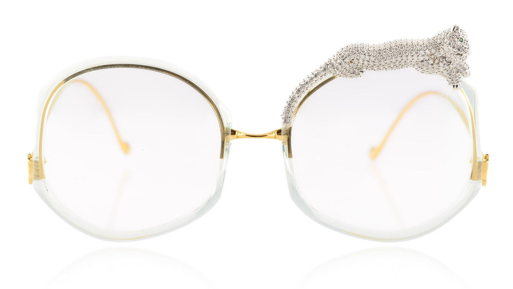 Luxurious oversized round eyeglasses with delicate gold-tone metal frames and a striking crystal-encrusted rose embellishment on the right upper frame. The design features elegant curved temples and a sophisticated minimalist bridge. The crystal rose detail adds a glamorous, avant-garde touch to these high-fashion prescription frames, making them a statement piece that combines artistic expression with wearable luxury.