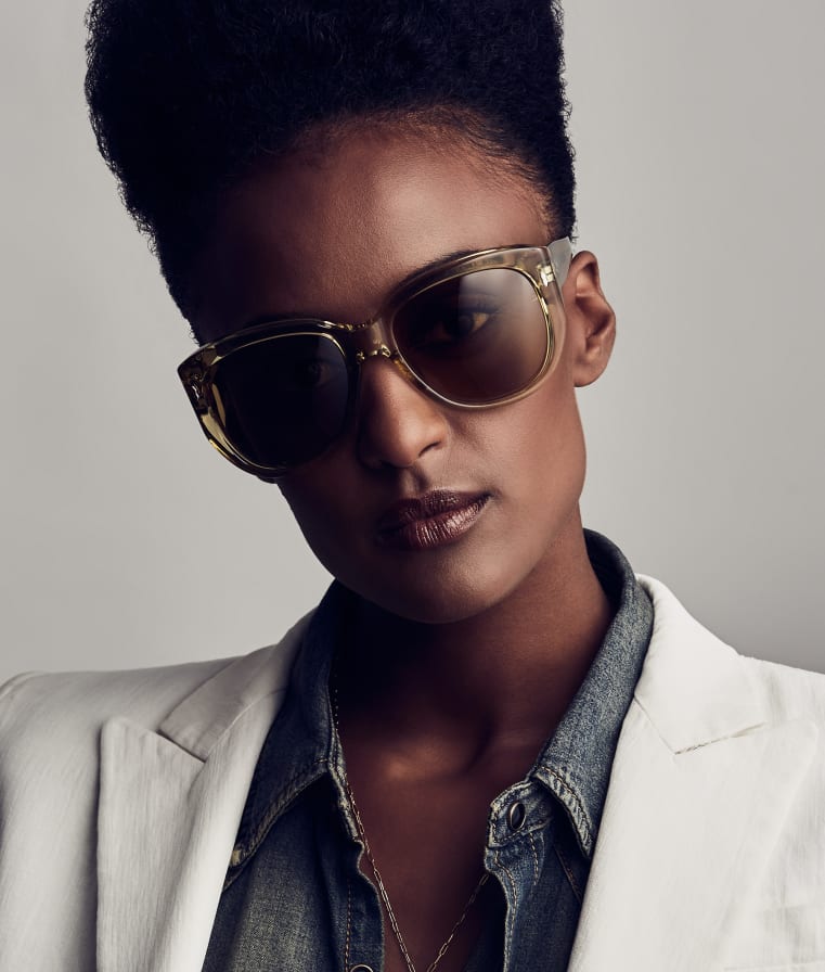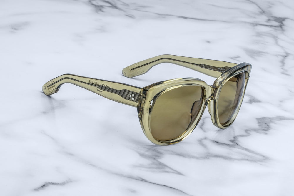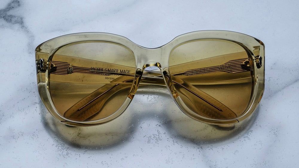 A sophisticated pair of translucent yellow-tinted sunglasses from Jacques Marie Mages Roxy line. The frames feature an elegant oval silhouette with a medium-thick construction and seamless design. The transparent amber/yellow acetate material gives them a luxurious, vintage-inspired look. The sunglasses showcase clean lines and minimal decorative elements, with subtle branding on the temple arms. The overall aesthetic is both retro and modern, perfect for a refined, fashion-forward style.