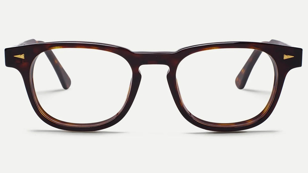 Classic square wayfarer-style frame in rich tortoiseshell acetate with subtle golden arrow accents at the temples. Features a refined saddle bridge and clean architectural lines that complement the warm brown tones. The design balances vintage inspiration with contemporary minimalism for a sophisticated, intellectual aesthetic.