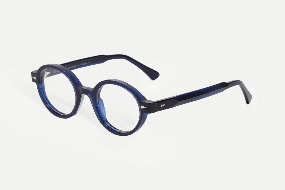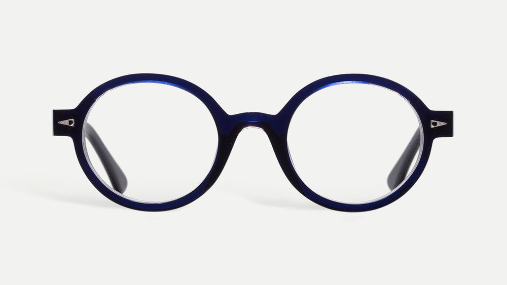 These are sophisticated round-framed glasses featuring a deep navy blue acetate frame with a distinctive retro-contemporary aesthetic. The frames have a substantial build with clean lines and subtle contouring around the rims. The design shows meticulous attention to detail with smooth finishing and subtle metallic accents at the temples. The overall silhouette projects an intellectual, artistic vibe while maintaining a timeless appeal suitable for various face shapes.