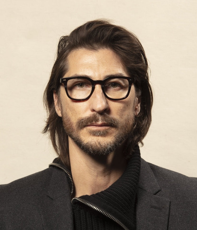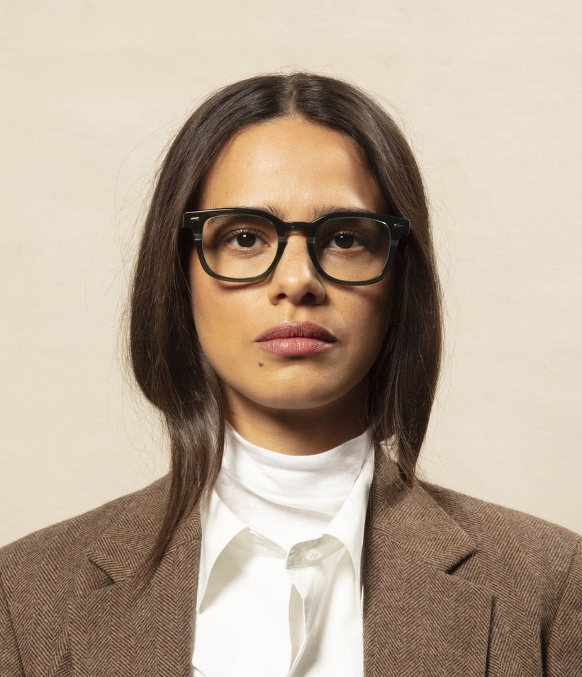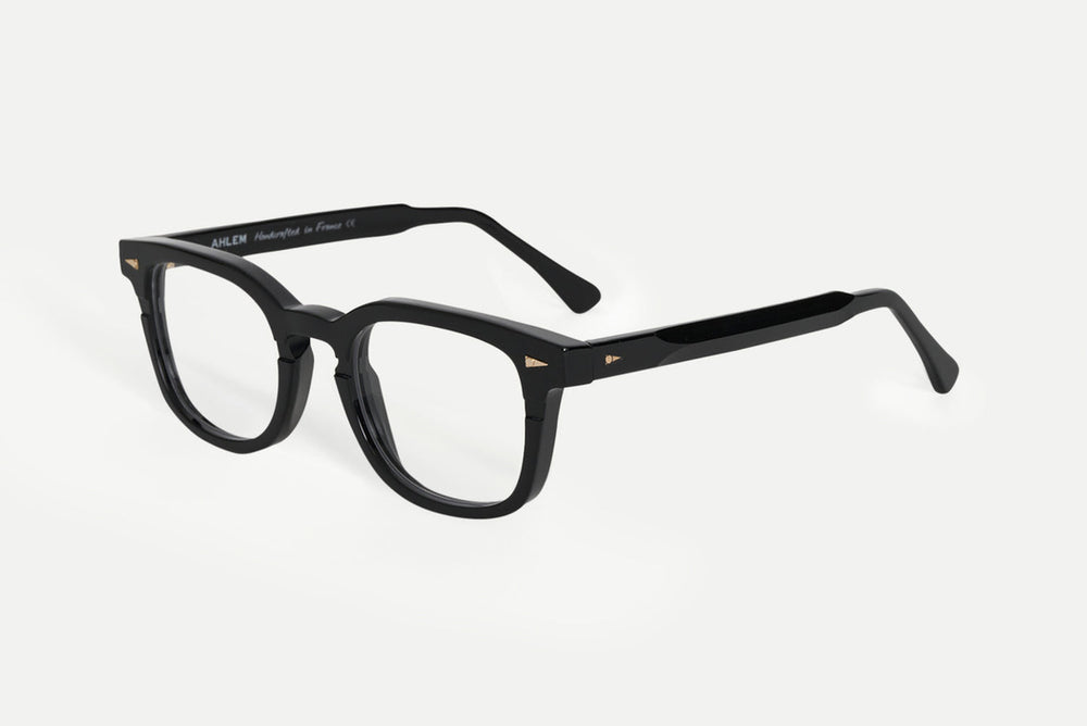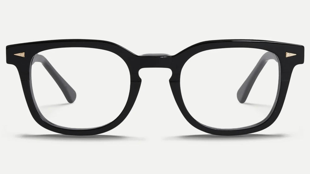 These are classic, sophisticated square frames with a bold black acetate construction. The design features subtle gold arrow accents at the temples, giving them a refined touch. The frames have a substantial presence with thick rims and clean geometric lines, creating a smart, intellectual aesthetic. The saddle bridge and wide temple arms maintain excellent proportions, while the slightly rounded edges of the square shape add a touch of softness to the otherwise bold design.