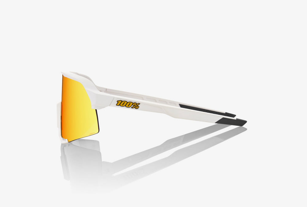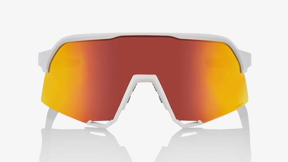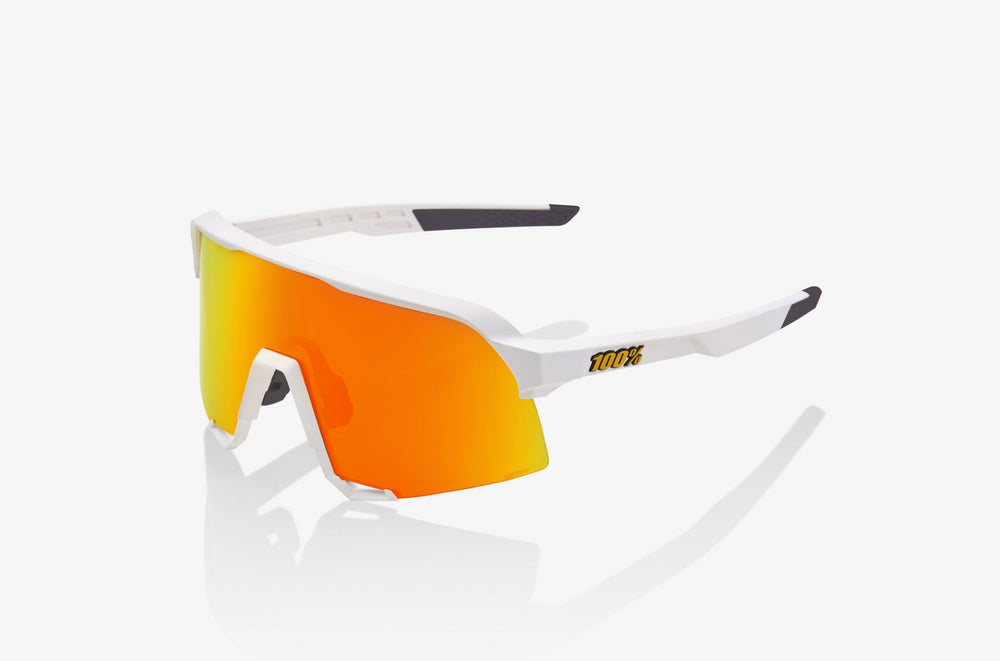 These are sleek, modern sport sunglasses with a striking shield-style lens design. The frame is minimalist and aerodynamic in matte white, featuring a single-piece mirrored orange/red gradient lens that wraps around for maximum coverage and protection. The design is distinctly performance-oriented, ideal for activities like cycling, running, or other outdoor sports. The sunglasses have a clean, futuristic aesthetic with smooth lines and integrated nose bridge. The temple arms are streamlined and likely engineered for secure fit during athletic activities.