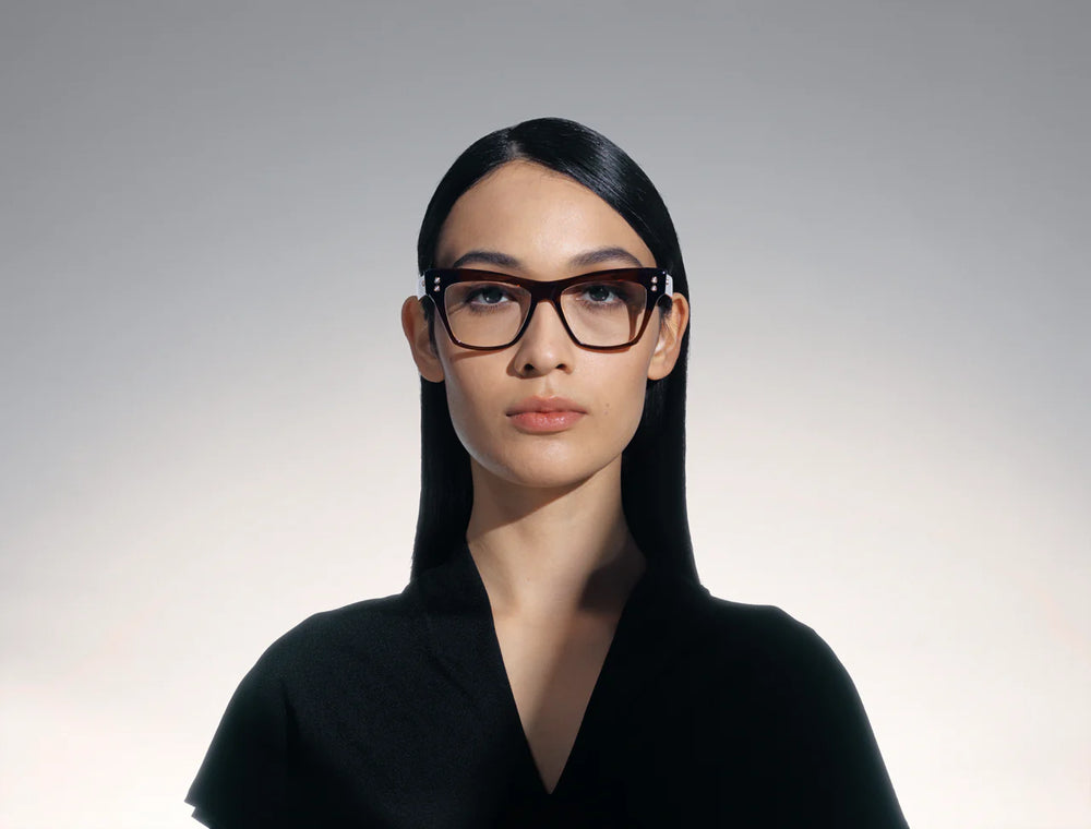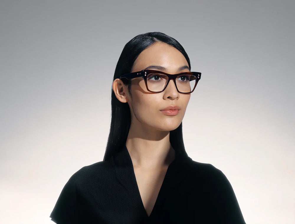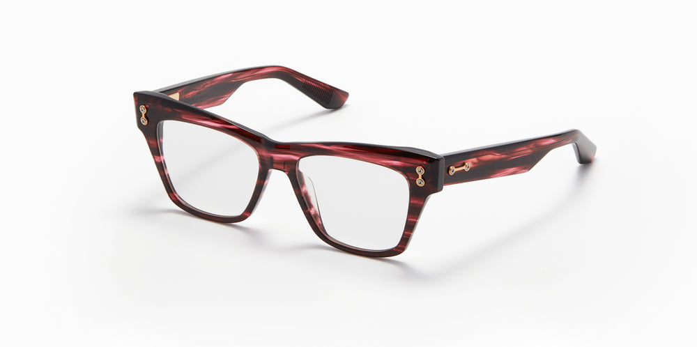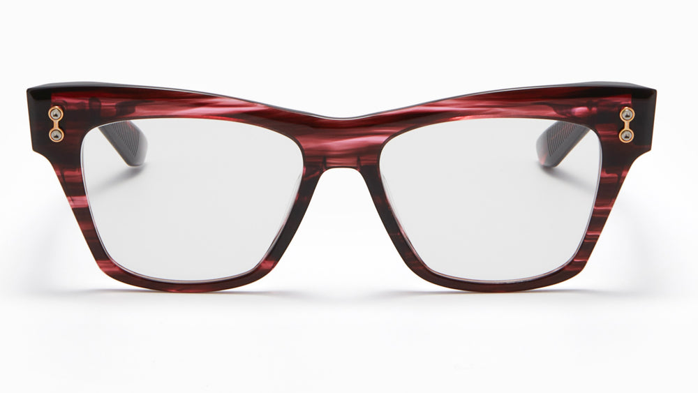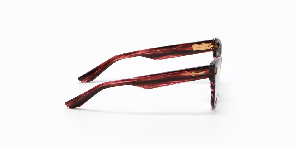 These are sophisticated rectangular frames in a rich burgundy-tinted tortoiseshell pattern. The frames feature distinctive gold hardware accents on the temples, adding an elegant touch to the design. The thick, bold frame construction creates a statement look while maintaining a classic silhouette. The translucent burgundy coloring shows beautiful depth and variation in the acetate material, particularly visible in the temple arms and front frame.