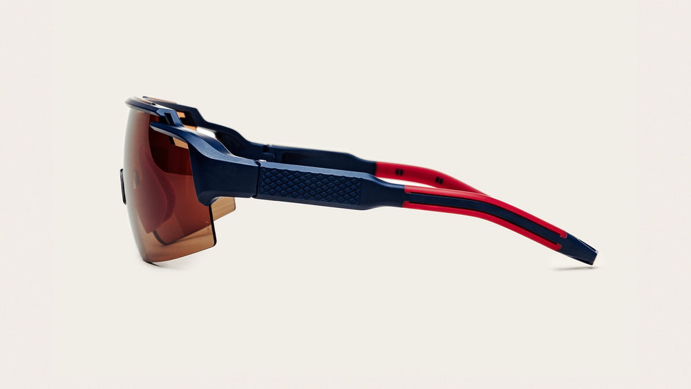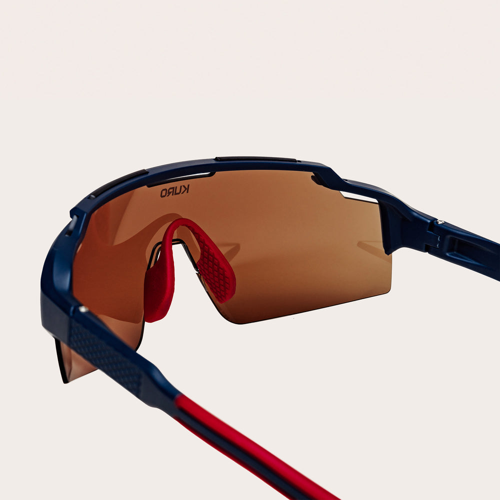Sleek and modern performance sunglasses featuring a shield-style lens design with a continuous one-piece brown tinted lens. The frame has an aggressive sporty aesthetic with angular details and ventilation features. The design includes protective side shields and a comfortable ergonomic fit suitable for athletic activities. The KURO branding is subtly visible on the lens. The sunglasses offer excellent coverage and appear to be designed for active outdoor use with their wrap-around style protection.