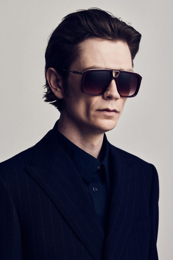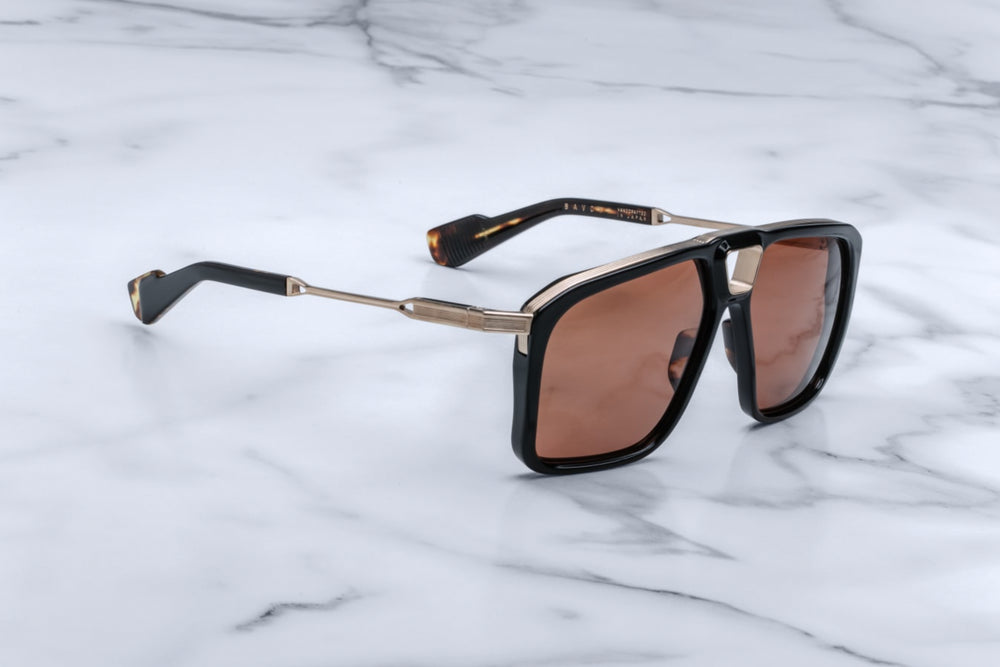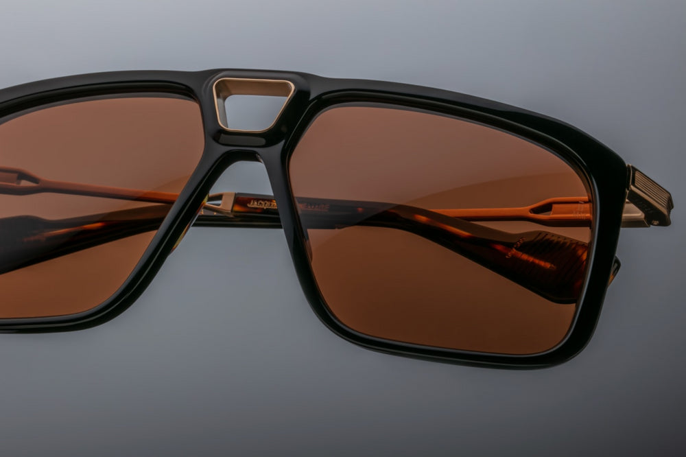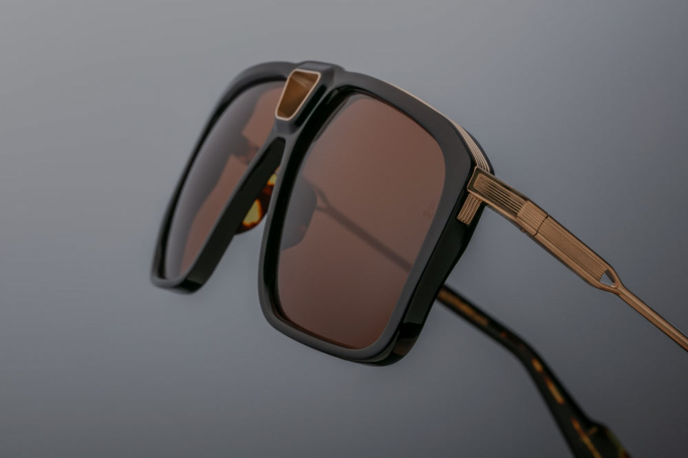 These are sophisticated oversized square sunglasses with a bold black acetate frame and distinctive brown-tinted lenses. The design features a prominent brow bar and clean geometric lines. The frame has a luxurious matte black finish contrasting nicely with gold-toned metal temple arms. The substantial build quality and architectural styling suggests high-end craftsmanship typical of Jacques Marie Mage designs. The sunglasses have an assertive, confident aesthetic that bridges vintage inspiration with contemporary luxury.