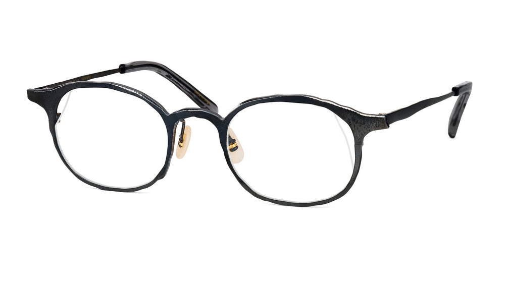 These distinctive metal frames feature a sophisticated oval shape with a minimalist design aesthetic. The frames have a textured matte black finish that gives them an industrial yet refined look. The thin profile and subtle curves create an understated elegance, while the nose pads ensure comfortable wear. The design shows careful attention to sculptural details while maintaining a clean, professional appearance suitable for any occasion.