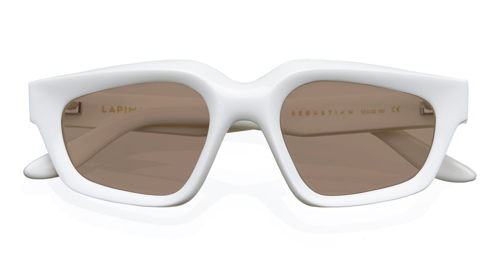 A bold and contemporary pair of white geometric sunglasses with a chunky, architectural frame design. The LAPIMA Sebastian features an angular, avant-garde silhouette with sharp edges and clean lines. The substantial white plastic frame is offset by brown-tinted lenses, creating a striking contrast. The saddle bridge integrates smoothly into the frames geometric design, while the white temple arms maintain the minimal, monochromatic aesthetic. These sunglasses embody a modern, fashion-forward style that makes a strong statement while remaining versatile enough for everyday wear.