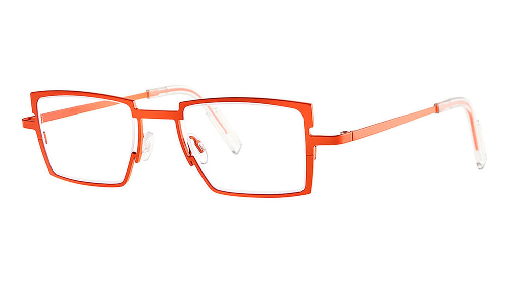 These striking geometric eyeglasses feature a bold angular design with sharp rectangular lenses and distinctive architectural elements. The frame showcases a vibrant orange metallic finish throughout, with clean minimalist lines creating a modern, avant-garde aesthetic. The slim temple arms complement the angular front frame, while the nose pads ensure comfortable wear. The design has a distinctly contemporary and artistic feel, characteristic of THEOs innovative eyewear approach.