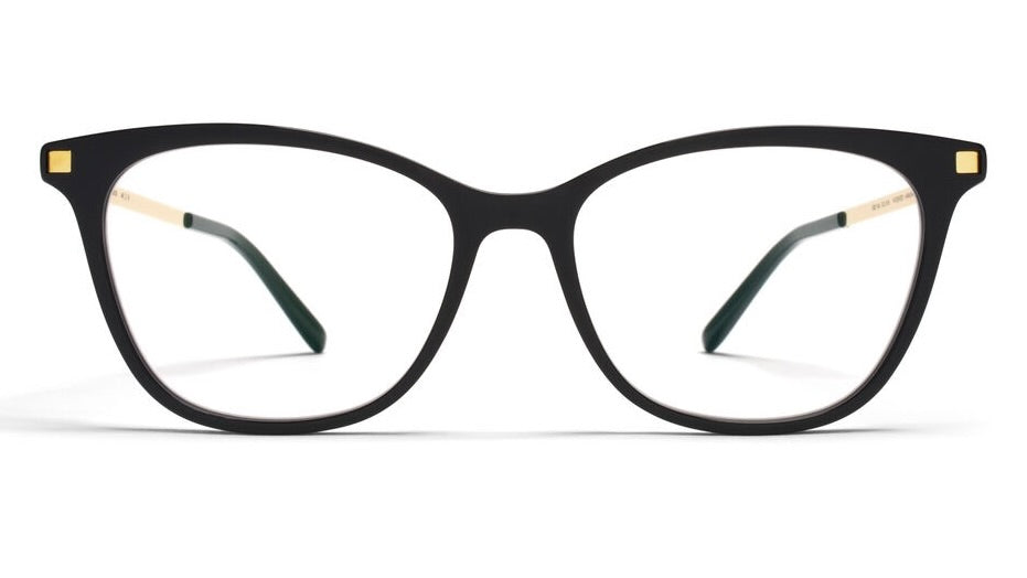 These are sophisticated cateye glasses featuring a matte black plastic frame with subtle gold accents at the temples. The frame has a contemporary interpretation of the classic cateye silhouette with clean lines and a gentle upward sweep. The design balances modern minimalism with timeless elegance, featuring slim temple arms in gold metal that create a striking contrast against the black frame. The saddle bridge provides comfortable fit, while the overall construction appears both lightweight and durable. Small golden studs at the frame corners add a refined decorative touch.