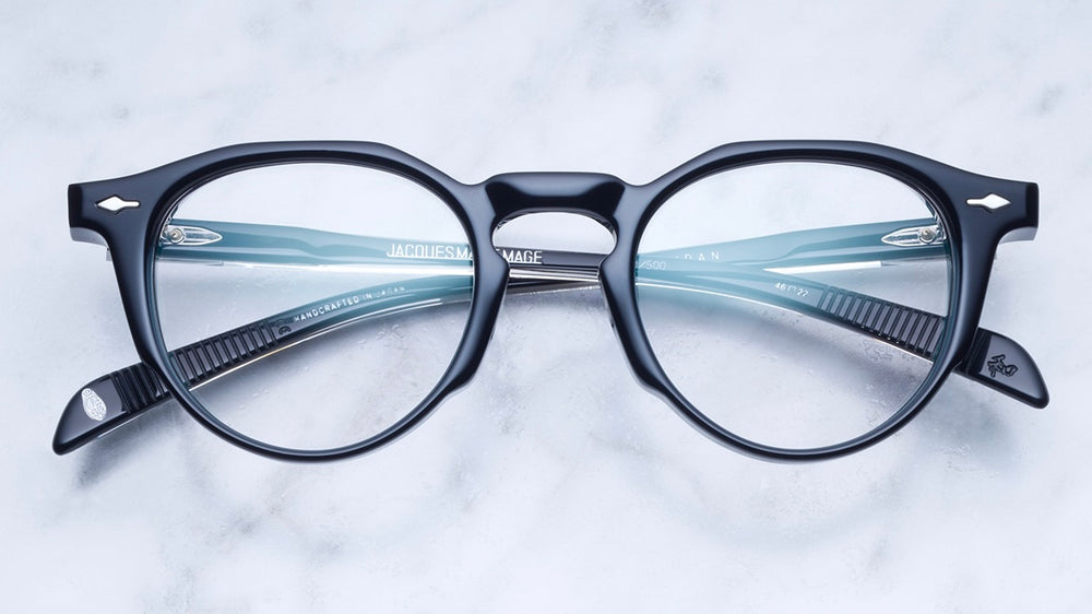 This is a sophisticated pair of Jacques Marie Mage eyeglasses featuring a bold round silhouette with a vintage-inspired design. The frame exhibits a premium matte black finish with a substantial acetate construction that speaks to luxury craftsmanship. The glasses feature distinctive diamond-shaped rivets on the front corners, characteristic of the brands attention to detail. The temple arms are sleek and streamlined, complementing the substantial front frame while maintaining elegance. The overall aesthetic is both classic and contemporary, suitable for the fashion-forward individual seeking a statement piece with timeless appeal.