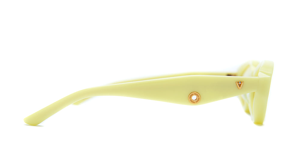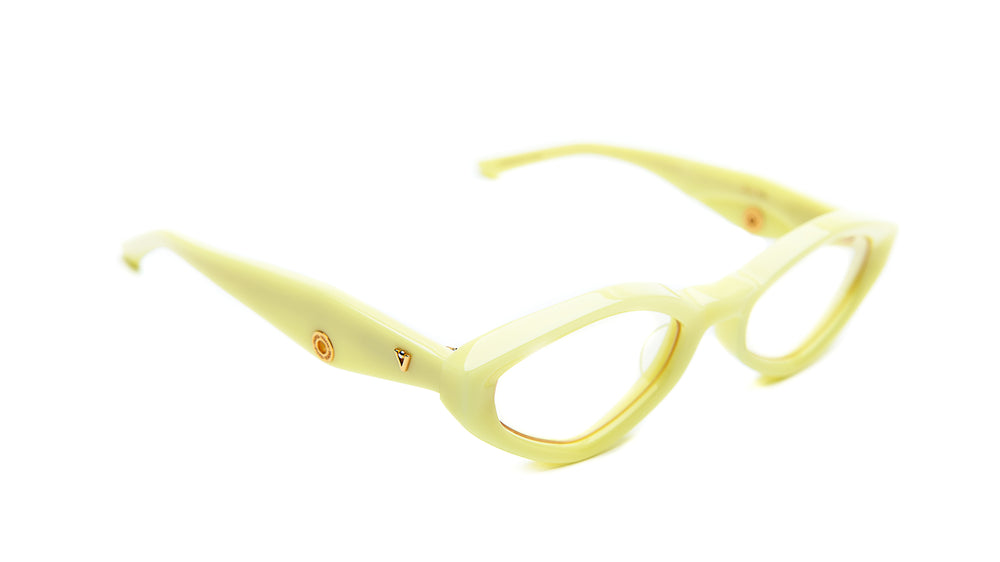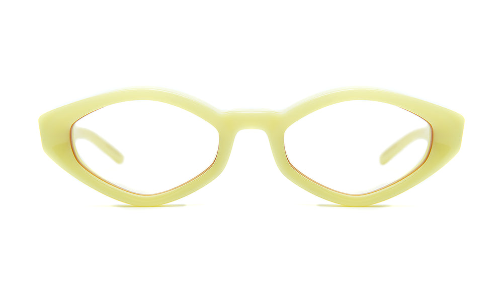 Retro-inspired geometric frames in a soft pastel yellow color with a distinctive angular shape. The frames feature a chunky, architectural design that makes a bold fashion statement. The monochromatic yellow colorway gives these glasses a modern, artistic feel while maintaining a feminine edge. The frames appear to be made from high-quality acetate with a matte finish, creating an elegant yet striking appearance suitable for fashion-forward individuals.