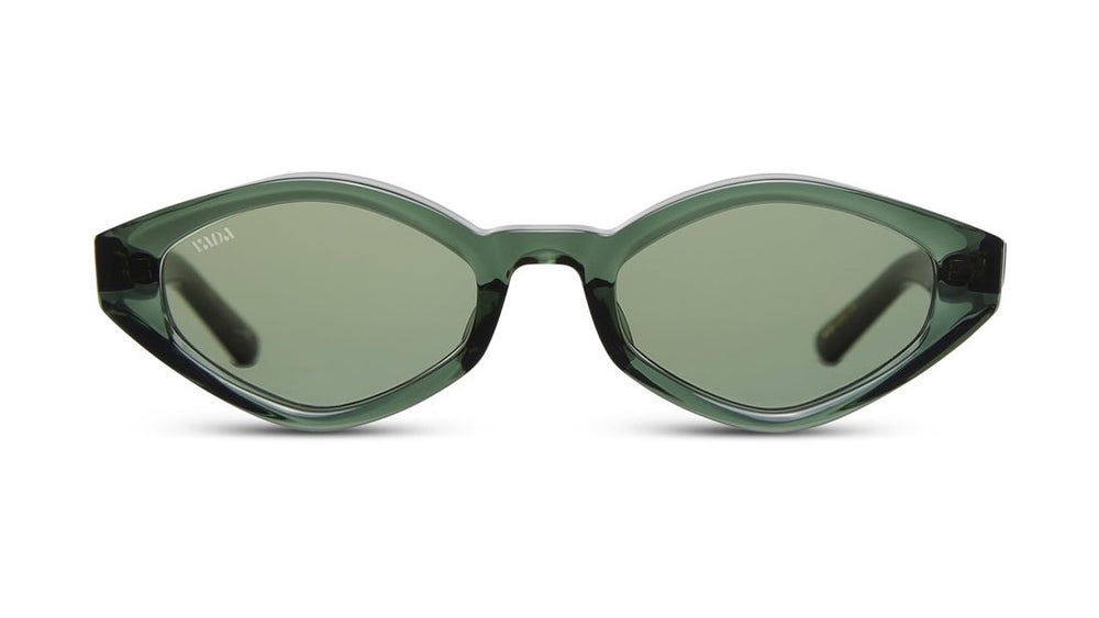 A sleek and contemporary pair of geometric sunglasses featuring a translucent forest green frame with a modern, angular silhouette. The frames have a distinctive diamond-like shape with smooth edges, offering a bold yet sophisticated look. The monochromatic design, with matching green lenses and frame, creates a cohesive aesthetic thats both trendy and timeless. The sunglasses have a medium-weight construction that balances durability with comfort, perfect for everyday wear or making a fashion statement.