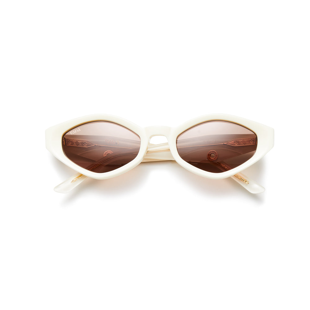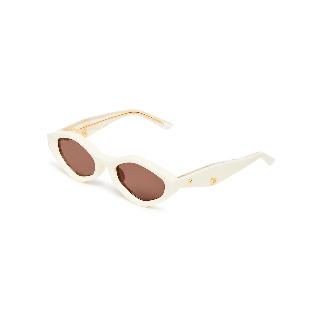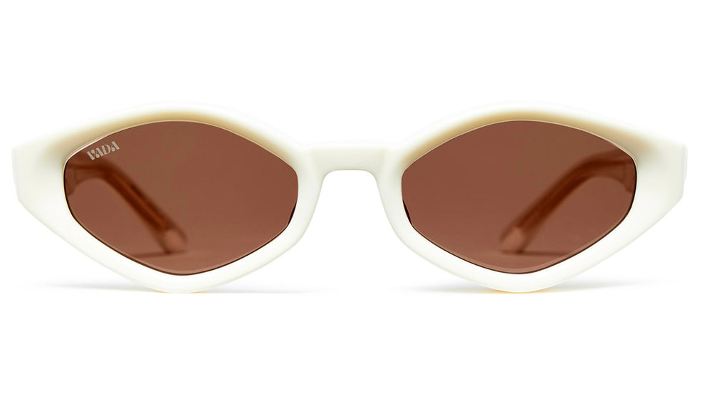 Striking retro-futuristic geometric sunglasses with angular white frames and brown-tinted lenses. The design features a distinctive diamond-like shape with sharp angles, creating a bold avant-garde aesthetic. The all-white frame construction gives these sunglasses a clean, modern look while maintaining their dramatic silhouette. The seamless integration of the temple arms and front piece creates a cohesive, sculptural appearance that would make a strong fashion statement.