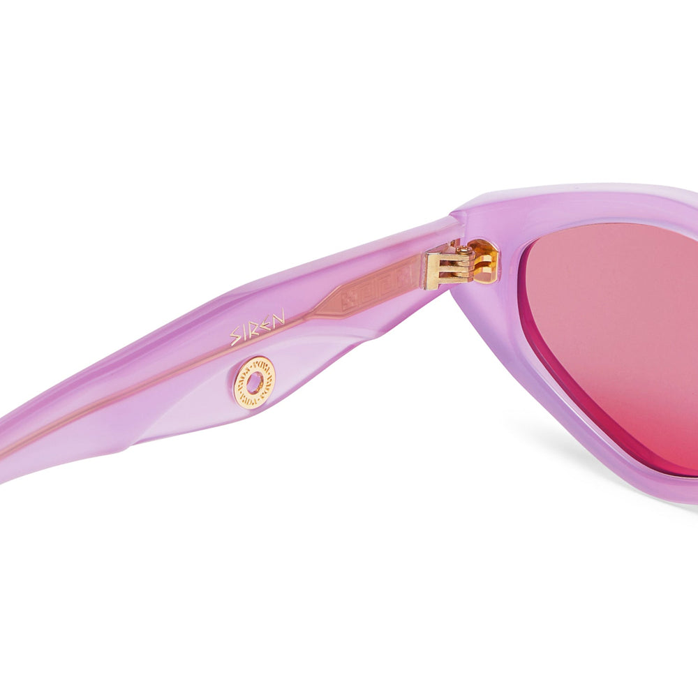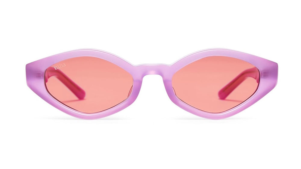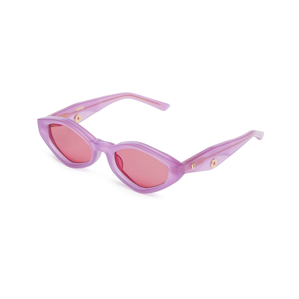 These stylish geometric sunglasses feature a bold, retro-inspired silhouette with thick pink translucent frames. The angular, diamond-like shape creates a striking avant-garde look while the pink-tinted lenses complement the frame color perfectly. The design exhibits a modern, fashion-forward aesthetic with clean lines and a seamless construction. The frames have a matte finish that adds sophistication to their candy-colored appearance, making them a perfect statement accessory for fashion-conscious wearers.
