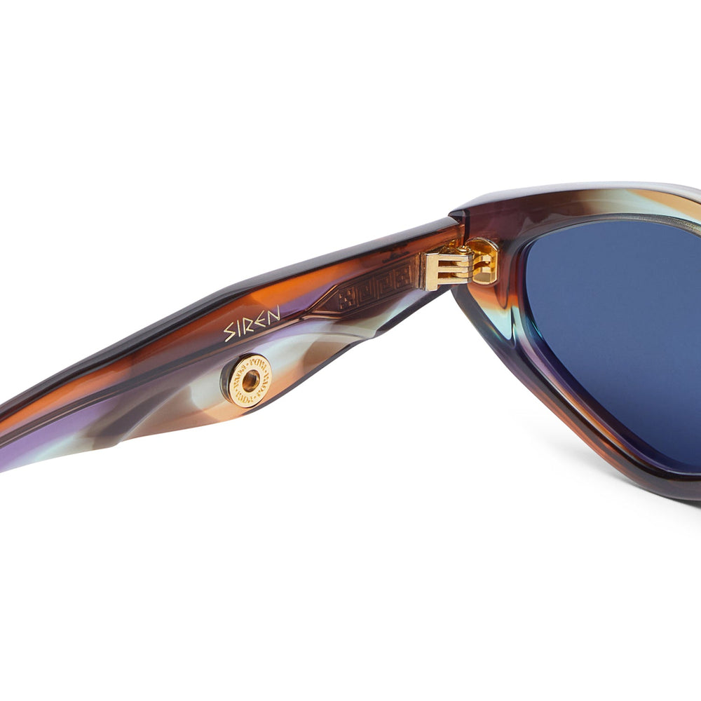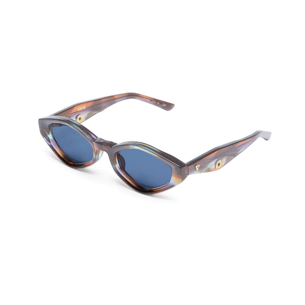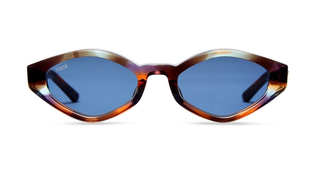 These are striking geometric sunglasses with a distinctive angular cat-eye influence. The frame features a beautiful tortoiseshell pattern in amber and brown tones that transitions from darker at the top to lighter at the bottom. The lenses are a solid medium blue color. The design has a retro-futuristic feel with sharp angles and slim proportions. The frame has a sleek, contemporary profile that would complement many face shapes. The tortoiseshell coloring shows subtle variations and depth, adding sophistication to the modern geometric design.