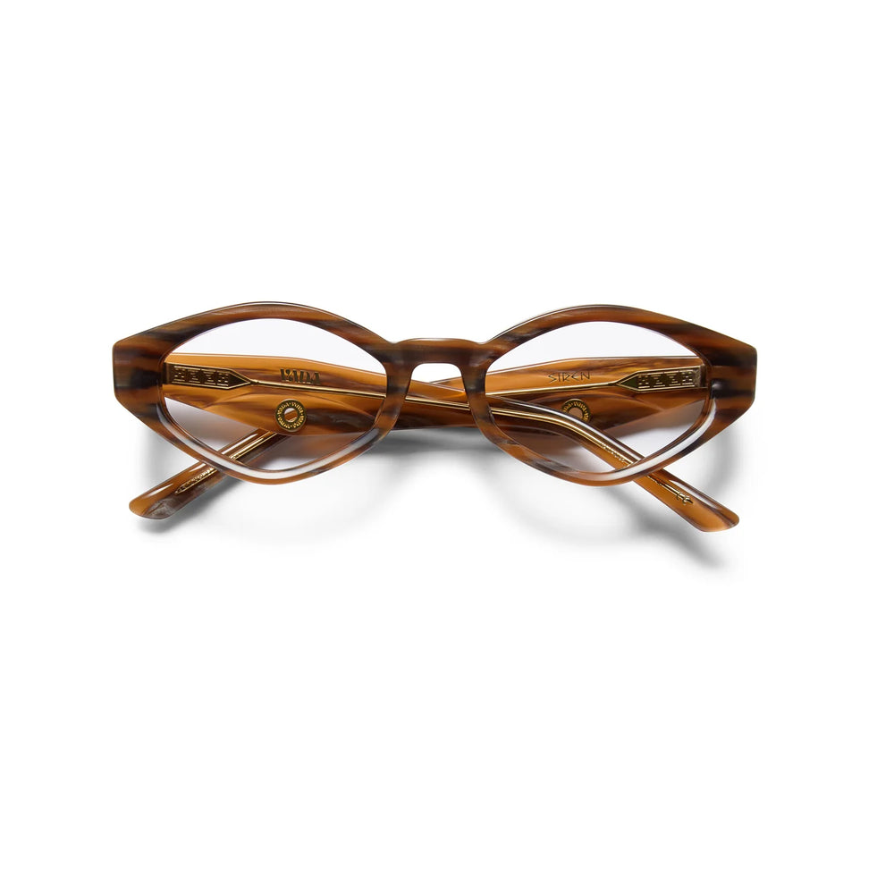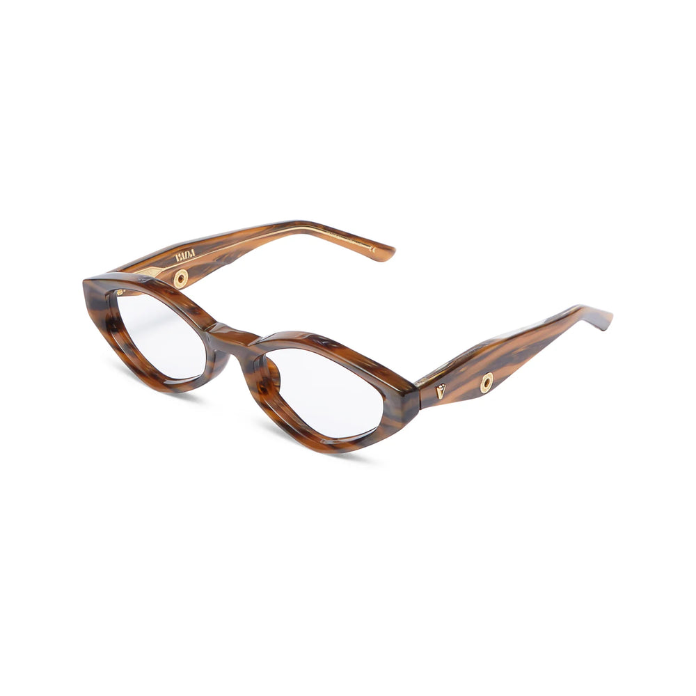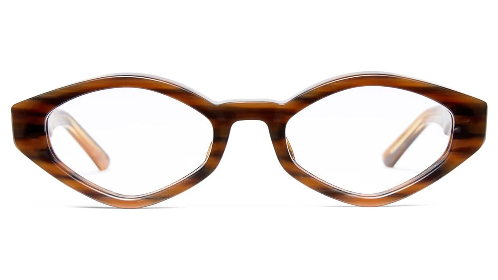 Striking geometric frames with an angular cat-eye inspired shape. Features a distinctive tortoiseshell pattern in warm amber and brown tones. The frames have a modern, avant-garde aesthetic with sharp angles and bold lines. The medium-thick construction gives these glasses a substantial presence while maintaining elegance. The tortoiseshell pattern shows beautiful depth and variation throughout the frame.