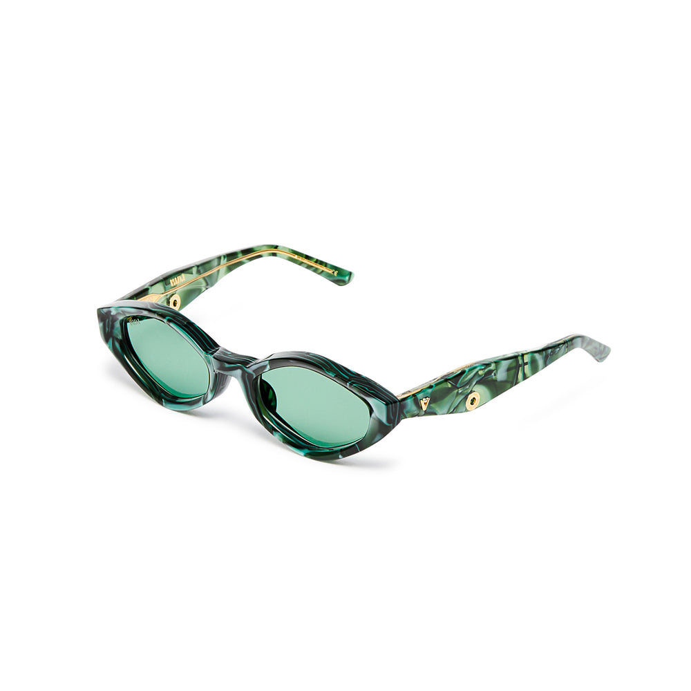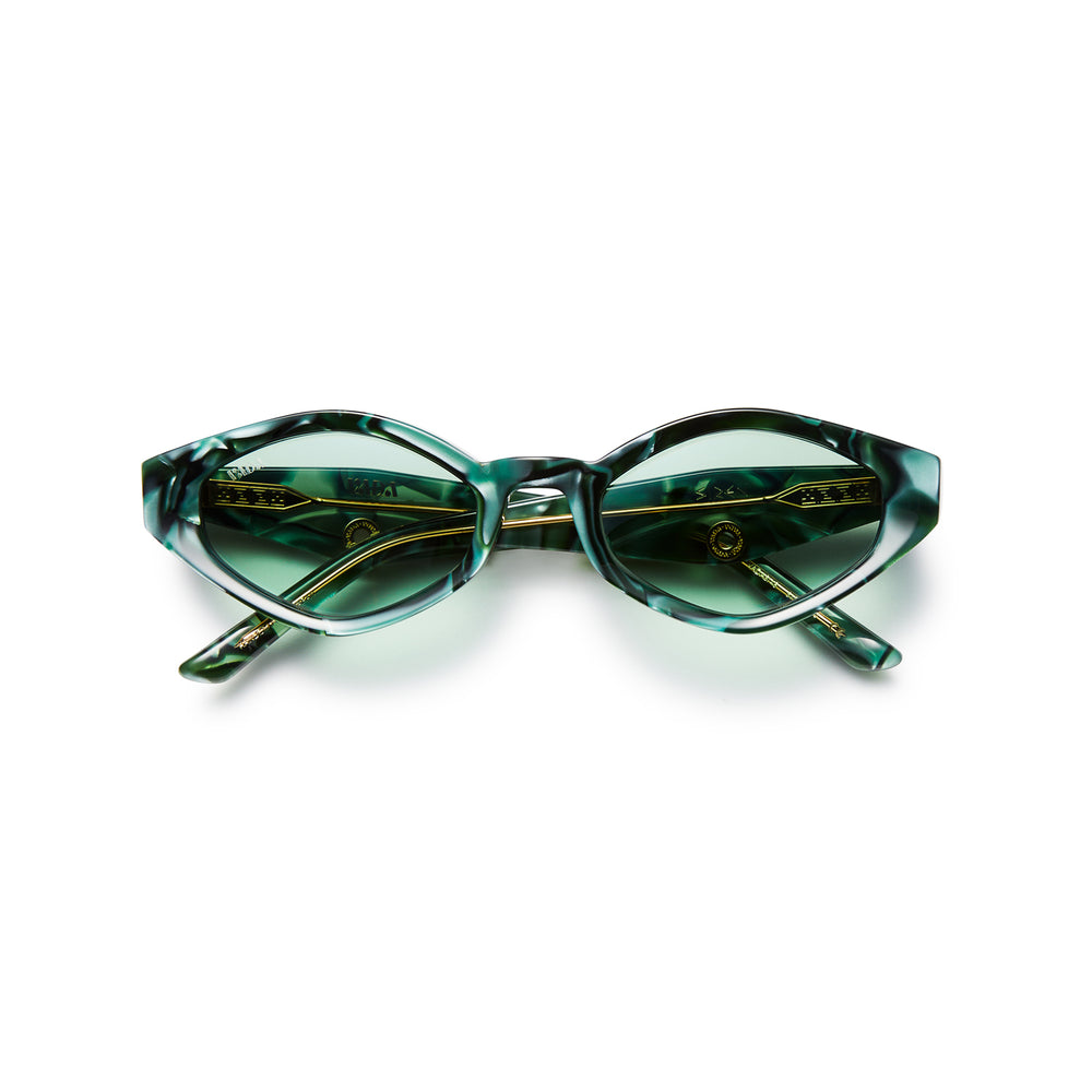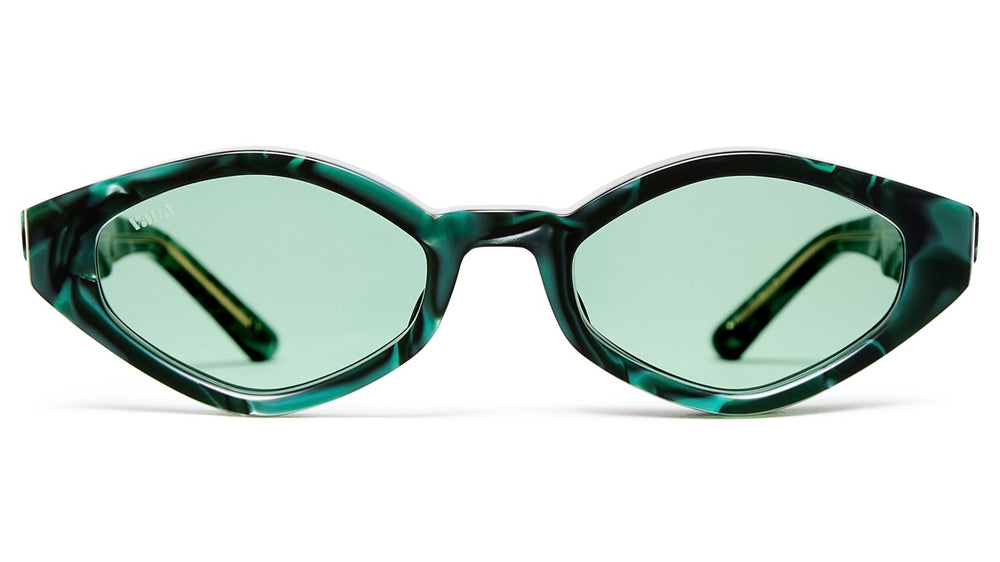 A stylish pair of geometric sunglasses featuring a striking emerald green marbled acetate frame. The distinctive angular shape gives these sunglasses a bold, avant-garde aesthetic. The frame has a medium thickness with a seamless integration of the bridge into the overall design. The lenses are a complementary sage green tint that adds to the monochromatic appeal. The temple arms maintain the same marbled green pattern as the front frame, creating a cohesive look. These sunglasses embody a contemporary, fashion-forward design that would appeal to those seeking a unique statement piece.