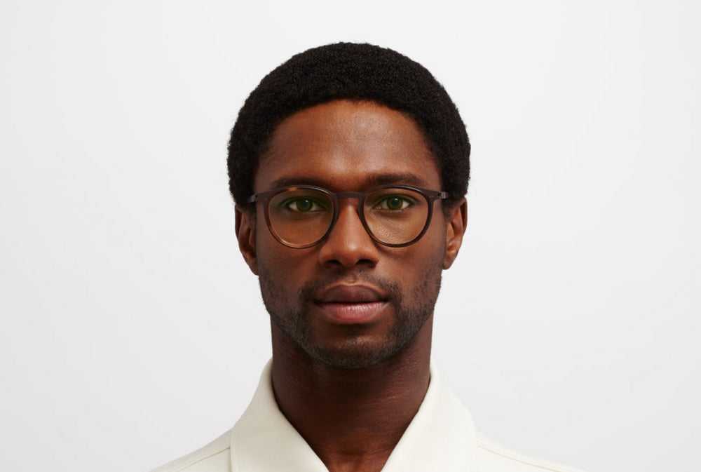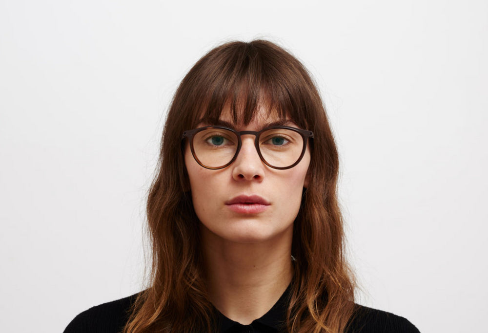 These lightweight, sophisticated round eyeglasses feature a delicate brown acetate front frame with metallic temple arms. The design combines modern minimalism with classic styling, featuring a refined nose bridge with adjustable nose pads for comfort. The thin profile and warm brown tones create an elegant, intellectual aesthetic suitable for both professional and casual wear. The frames have a subtle gradient effect from darker to lighter brown tones, adding depth to their appearance.
