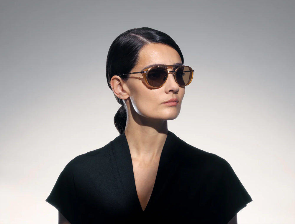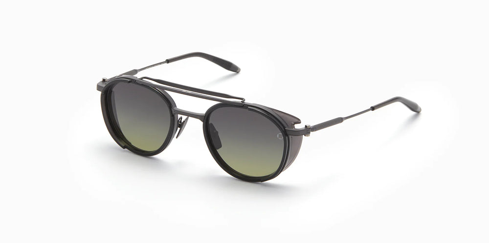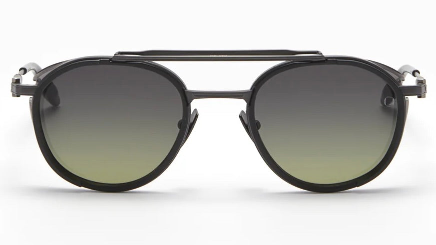 These sophisticated aviator-style sunglasses feature a distinctive double bridge design with a matte black metal frame. The lenses showcase an elegant gradient effect transitioning from dark grey to olive green. The frame demonstrates excellent craftsmanship with refined details around the rim and sleek temple arms. The nose pads are adjustable for comfort, and the overall aesthetic strikes a perfect balance between classic aviation style and modern luxury. The sunglasses have a professional, high-end appearance suitable for both casual and formal occasions.