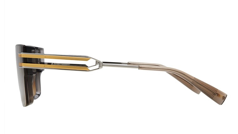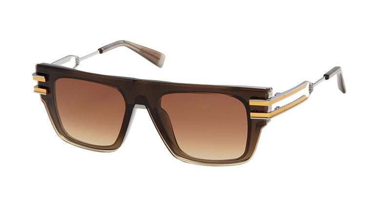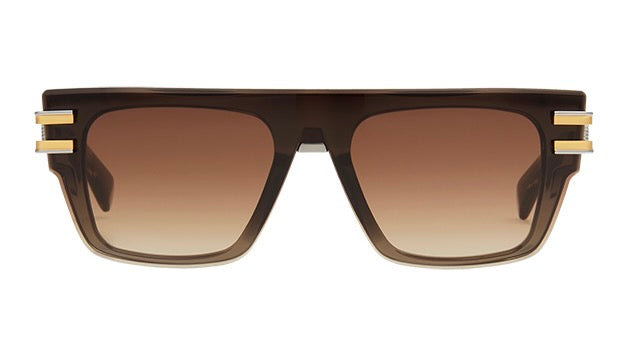 These are luxurious designer sunglasses featuring a bold, rectangular silhouette with a gradient brown colorway that transitions from darker at the top to lighter at the bottom. The frame has a distinctive architectural design with metallic gold double-bar accents on the temples, giving it a sophisticated military-inspired aesthetic. The thick, substantial plastic construction suggests durability and premium quality, while the gradient lenses offer both style and functionality. The overall design shows attention to detail with its seamless integration of materials and clean lines, embodying both modern luxury and classic eyewear design principles.