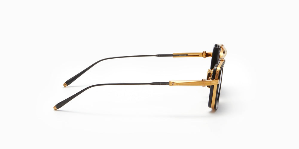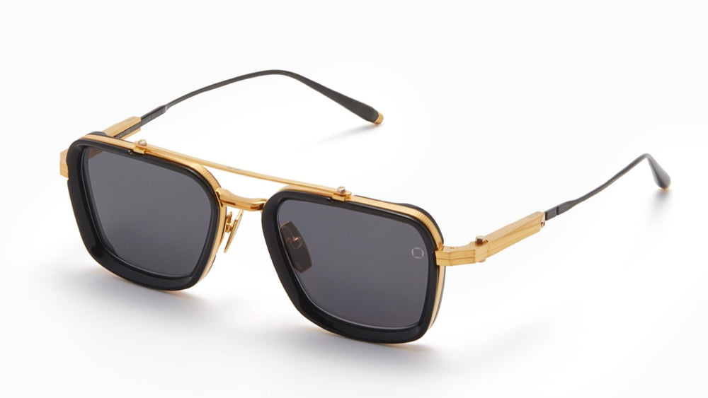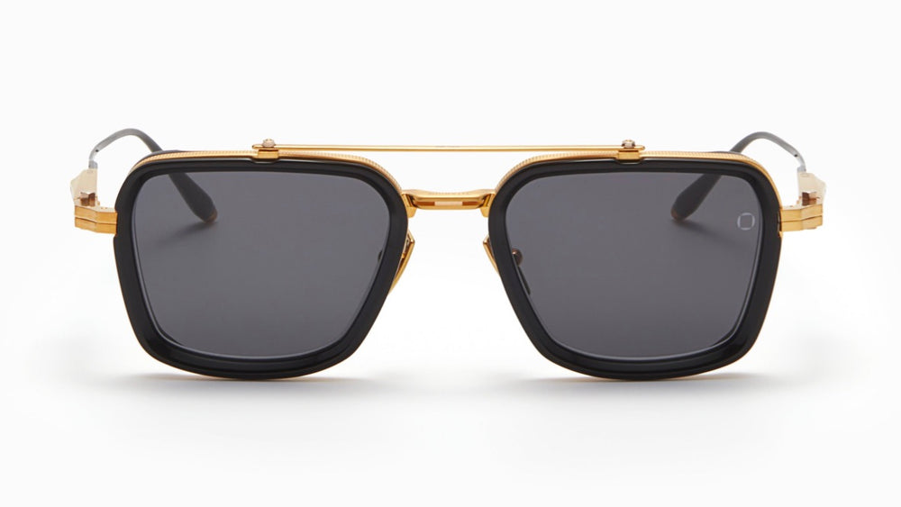 These sophisticated sunglasses feature a distinctive geometric frame design with a black front rim and elegant gold double bridge and temple arms. The frame combines contemporary styling with luxury details, showcasing a bold geometric silhouette with dark grey lenses. The construction demonstrates premium craftsmanship with its metal framework and sleek nose pads. The gold accents on the temple arms and bridge create a striking contrast against the black frame front, resulting in a refined, modern aesthetic suitable for fashion-forward individuals.