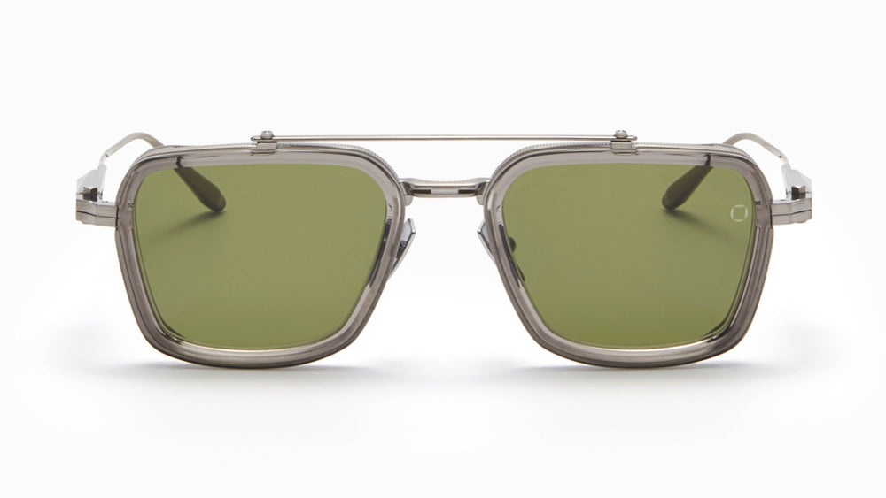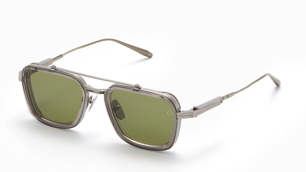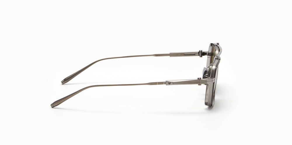 These contemporary sunglasses feature a distinctive geometric silhouette with a transparent grey acetate frame surrounding metal rims. The double bridge design creates an architectural look, while the green-tinted lenses add a sophisticated touch. The sleek metal temple arms and nose pads ensure a comfortable fit. The overall design strikes a balance between modern aesthetics and classic functionality, making them suitable for various face shapes. The clear grey frame material adds a subtle translucent effect that complements the metallic elements.