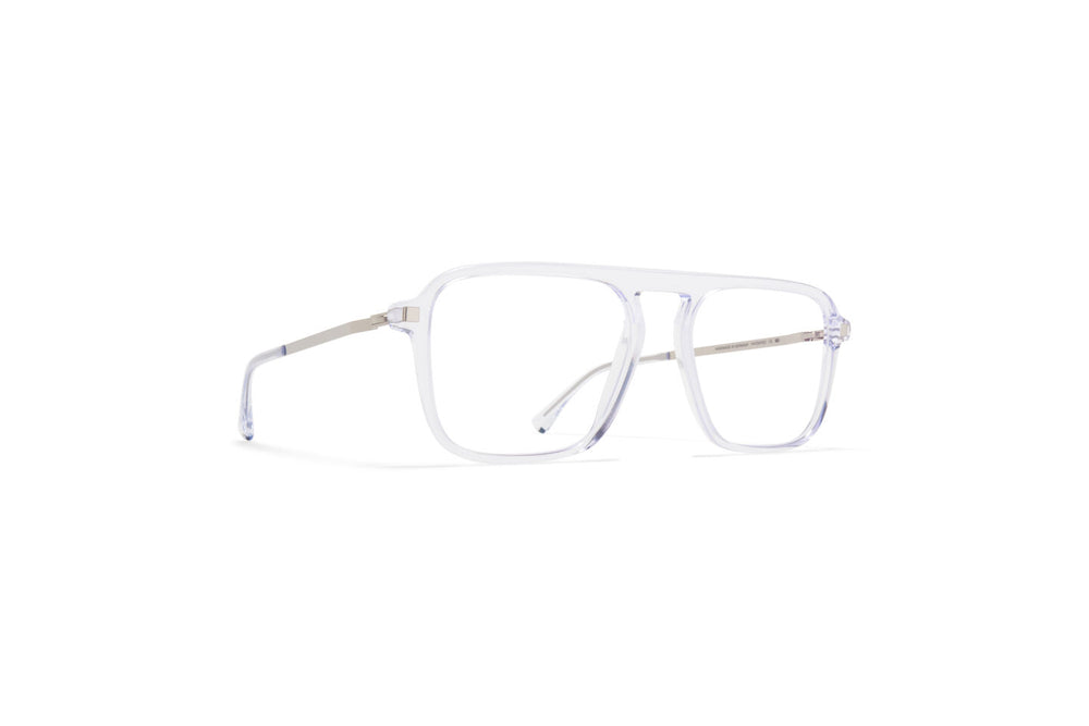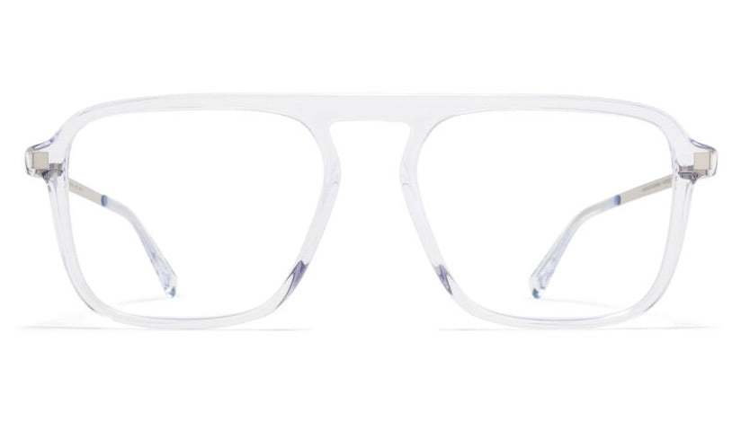 A modern, architectural eyewear piece featuring a translucent crystal-clear frame with a distinctive square silhouette. The frame showcases clean lines and a minimalist aesthetic with subtle metal accents on the temple arms. The design bridges contemporary styling with functional elegance, offering a sophisticated look suitable for both professional and casual settings. The transparent construction creates an almost floating appearance while maintaining structural integrity.