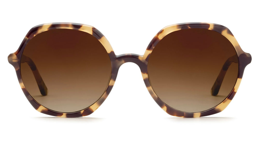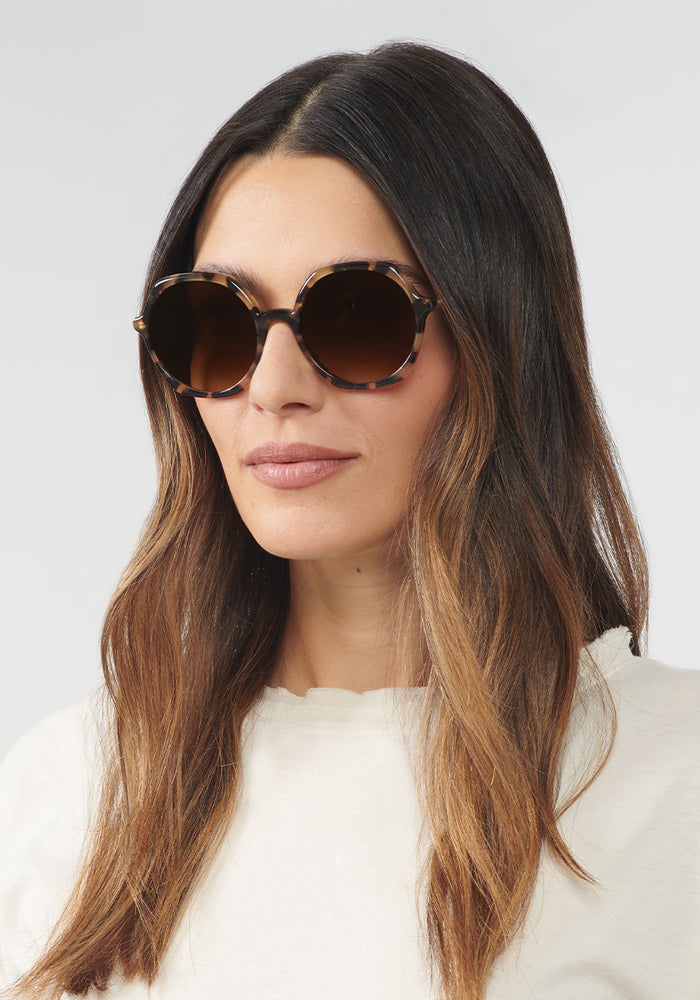 These oversized round sunglasses feature a luxurious tortoiseshell acetate frame in warm honey and dark brown tones. The gradient brown lenses complement the frame perfectly. The design showcases a vintage-inspired silhouette with subtly curved temple arms and a comfortable saddle bridge. The frame has a sophisticated, timeless appeal that would pair well with both casual and dressy outfits. The proportions are particularly flattering for larger face shapes, while the gradient lenses provide excellent sun protection while maintaining visibility.