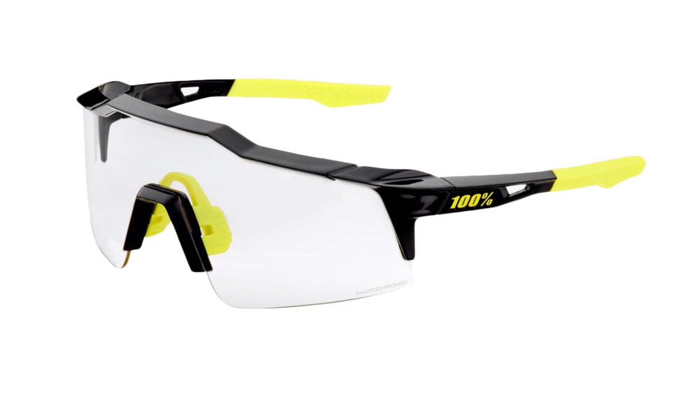 Sleek sports performance sunglasses with a distinctive shield-style lens design. Features a semi-rimless frame with bold black/neon yellow accents creating an aggressive athletic aesthetic. The wraparound style provides excellent coverage and protection while the minimalist nose bridge and temple arms optimize comfort during intense activities. The 100% branding is subtly placed on the temple. Perfect for cycling, running or other high-intensity outdoor sports.